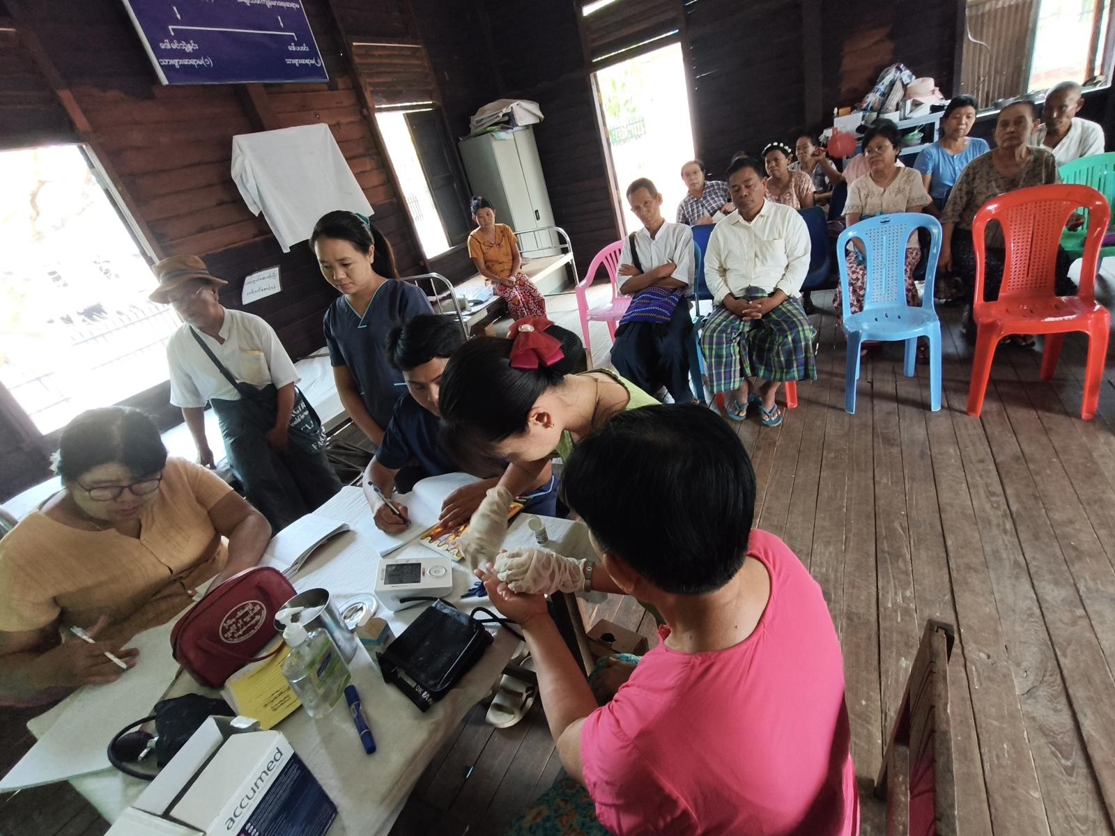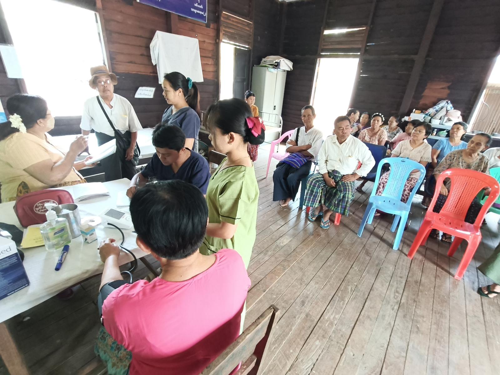 နိုင်ငံ့ဝန်ထမ်းအငြိမ်းစားများအား ကျန်းမာရေးစစ်ဆေးခြင်းနှင့် ဆေးကုသပေးရာတွင် မြို့နယ်ပြည်သူ့ကျန်းမာရေးဦးစီးဌာနမှ ကျန်းမာရေးဝန်ထမ်း ဆရာ၊ ဆရာမများက အငြိမ်းစားဝန်ထမ်များအား စာရင်းပေးသွင်းပြီး သွေးပေါင်ချိန်တိုင်းတာခြင်း၊ ဆီးချို၊ သွေးချိုစစ်ဆေးပေးခြင်း၊ နှလုံးစစ်ဆေးပေးခြင်းနှင့် လိုအပ်သည့်ဆေးဝါးများအား အခမဲ့ဆောင်ရွက်ပေးခဲ့သည်။