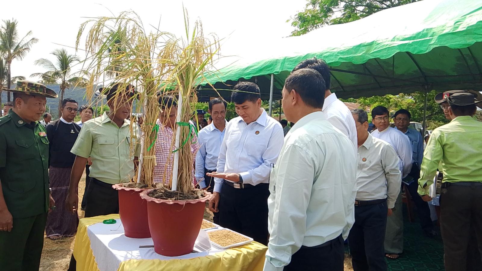 မွန်ပြည်နယ်၊ စိုက်ပျိုးရေးဦးစီးဌာန၊ သထုံခရိုင်၊ ပေါင်မြို့နယ်ရှိ ရေဆင်းပေါ်ဆန်း (၁)၊ (၂) စပါးမျိုးသစ်များ ဒေသနှင့်ကိုက်ညီမှု ရှိ/မရှိ စမ်းသပ်စိုက်ပျိုးထားရှိမှုအခြေအနေ ကွင်းသရုပ်ပြပွဲအခမ်းအနားကို ယမန်နေ့ နံနက်ပိုင်းက ပေါင်မြို့နယ် ဖြူဘကျေးရွာတောင်သူဦးသန်းထွန်း၏ လယ်မြေ၌ ကျင်းပပြုလုပ်ရာ မွန်ပြည်နယ် ဝန်ကြီးချုပ် ဦးအောင်ဝင်းသန်း၊ ပြည်နယ်အစိုးရအဖွဲ့ဝင် ဝန်ကြီးများနှင့် တာဝန်ရှိသူများ တက်ရောက်သည်။