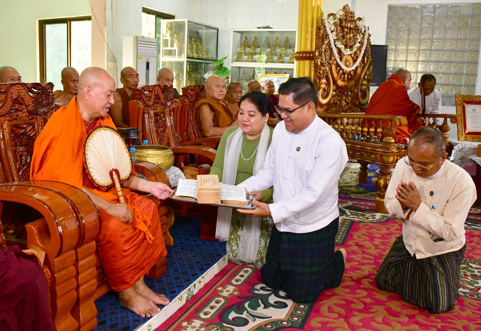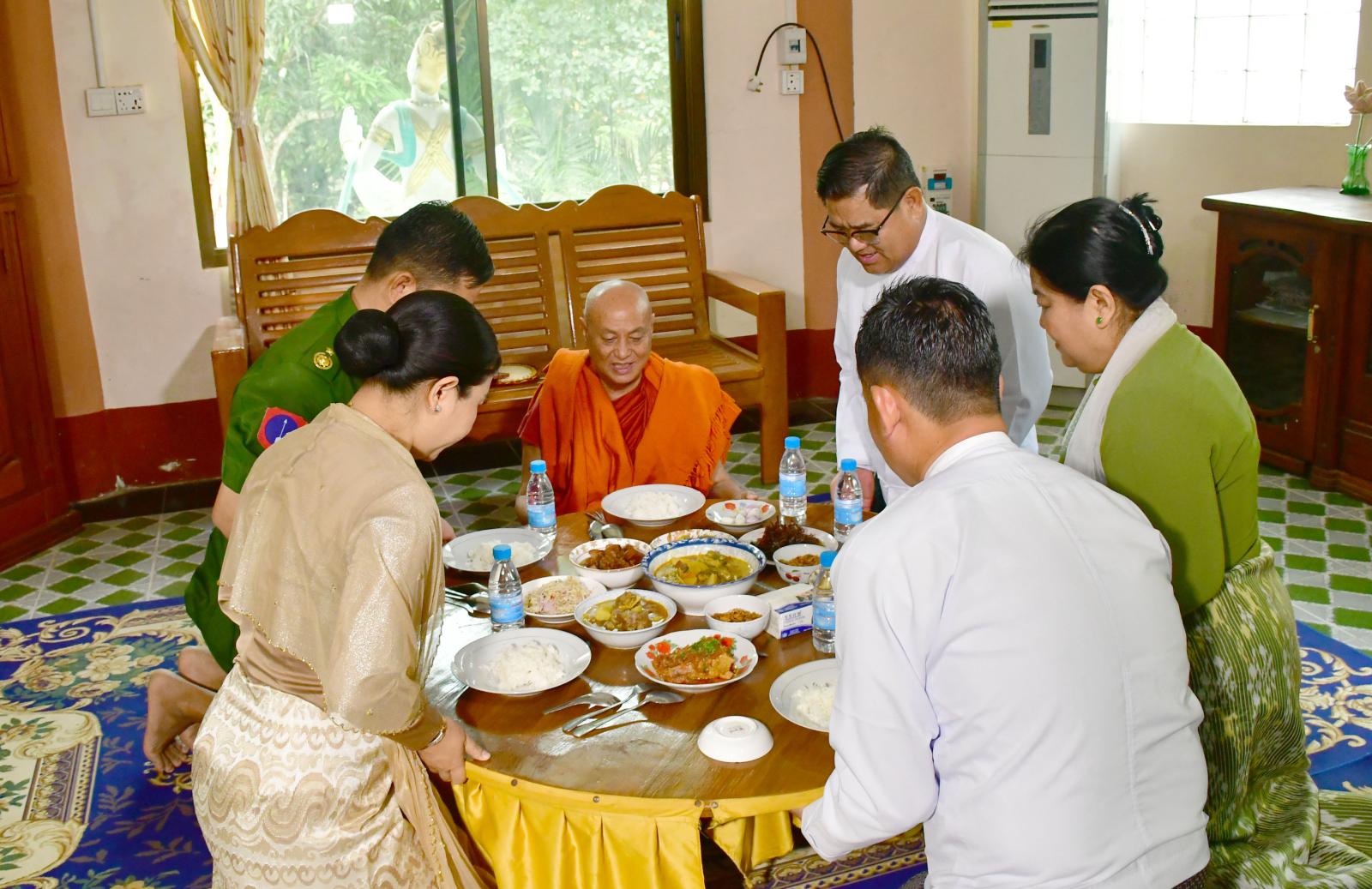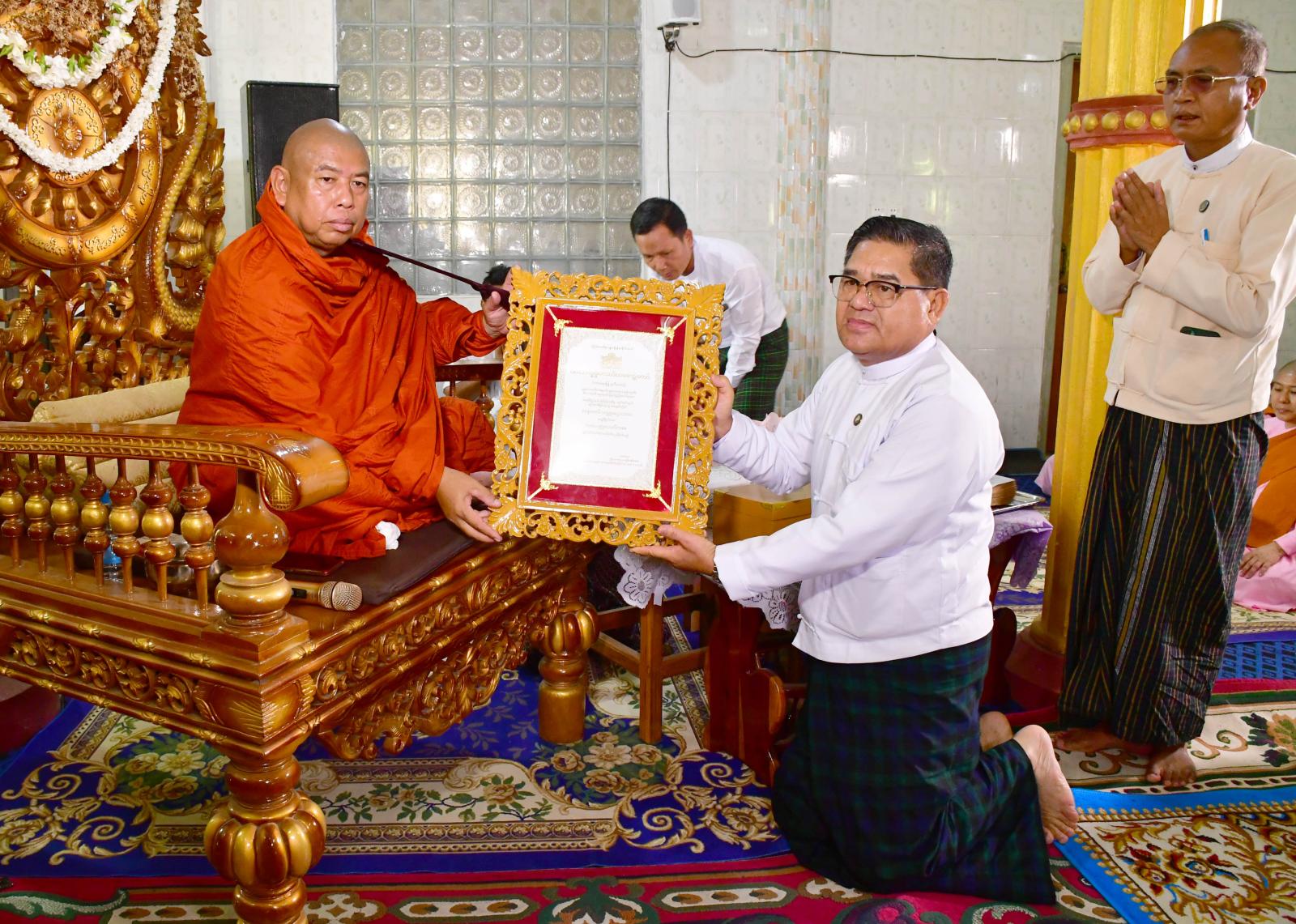 ယင်းနောက် ဘွဲ့တံဆိပ်တော်ရ ဆရာတော်အရှင်သူမြတ်က ကျေးဇူးတင်ဝမ်းမြောက်ကြောင်းစကား မိန့်ကြားတော်မူပြီး ပြည်နယ်ဝန်ကြီးချုပ်နှင့် ဇနီး၊ တိုင်းမှူးနှင့် ဇနီး၊ တာဝန်ရှိသူများက ဆရာတော် အရှင်သူမြတ်များအား လှူဖွယ်ပစ္စည်းများ ဆက်ကပ်လှူဒါန်းခဲ့ကြသည်။