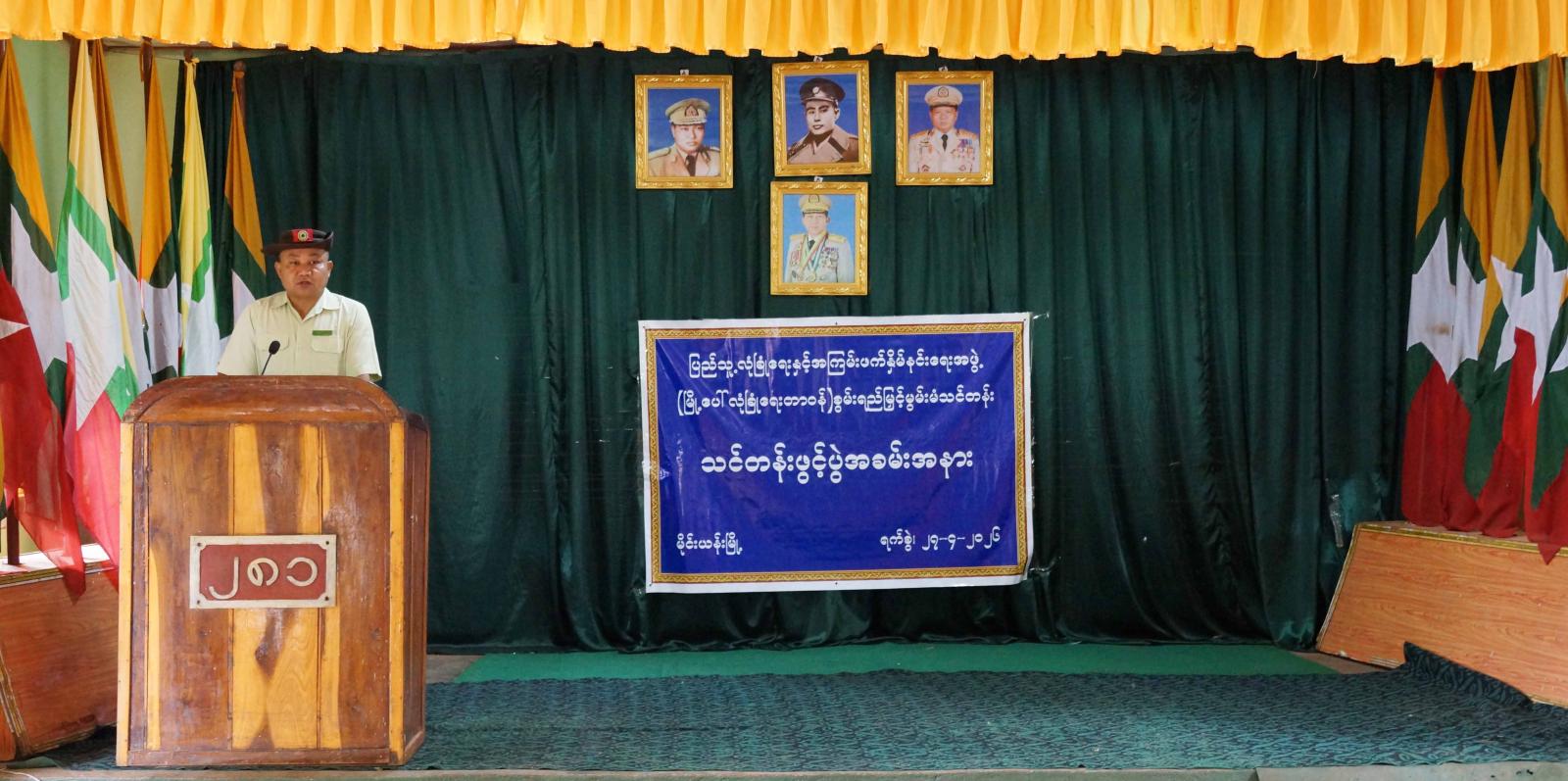 အဆိုပါ အခမ်းအနားတွင် ခရိုင်ပြည်သူ့လုံခြုံရေးနှင့်အကြမ်းဖက်နှိမ်နင်းရေး ကြီးကြပ်ကွပ်ကဲမှုအဖွဲ့ဥက္ကဋ္ဌ ဦးလင်းသန့်က ဖွင့်ပွဲမိန့်ခွန်းပြောကြားပြီး ပြည်သူ့လုံခြုံရေးနှင့် အကြမ်းဖက်နှိမ်နင်းရေးကြီးကြပ်ကွပ်ကဲမှုအဖွဲ့ဝင် ဗိုလ်မှူးကျော်မင်းဋ္ဌေးမှ သင်တန်းတွင် သင်ကြားမည့် သင်ခန်းစာများနှင့်ပတ်သတ်၍ ရှင်းလင်းပြောကြားသည်။ ဆက်လက်၍ မြို့နယ်ပြည်သူ့လုံခြုံရေးနှင့် အကြမ်းဖက်နှိမ်နင်းရေးကြီးကြပ်ကွပ်ကဲမှုအဖွဲ့ဥက္ကဋ္ဌ ဦးအောင်ဇင်ဦးက ပြည်သူ့လုံခြုံရေးနှင့်အကြမ်းဖက်နှိမ်နင်းရေးအဖွဲ့ထံသို့ ထောက်ပံ့ငွေများလွှဲပြောင်းပေးအပ်ရာ ပြည်သူ့လုံခြုံရေးနှင့် အကြမ်းဖက်နှိမ်နင်းရေးကြီးကြပ်ကွပ်ကဲမှုအဖွဲ့ဝင် ဗိုလ်မှူးကျော်မင်းဋ္ဌေးမှ လက်ခံရယူခဲ့ကြောင်း သိရသည်။