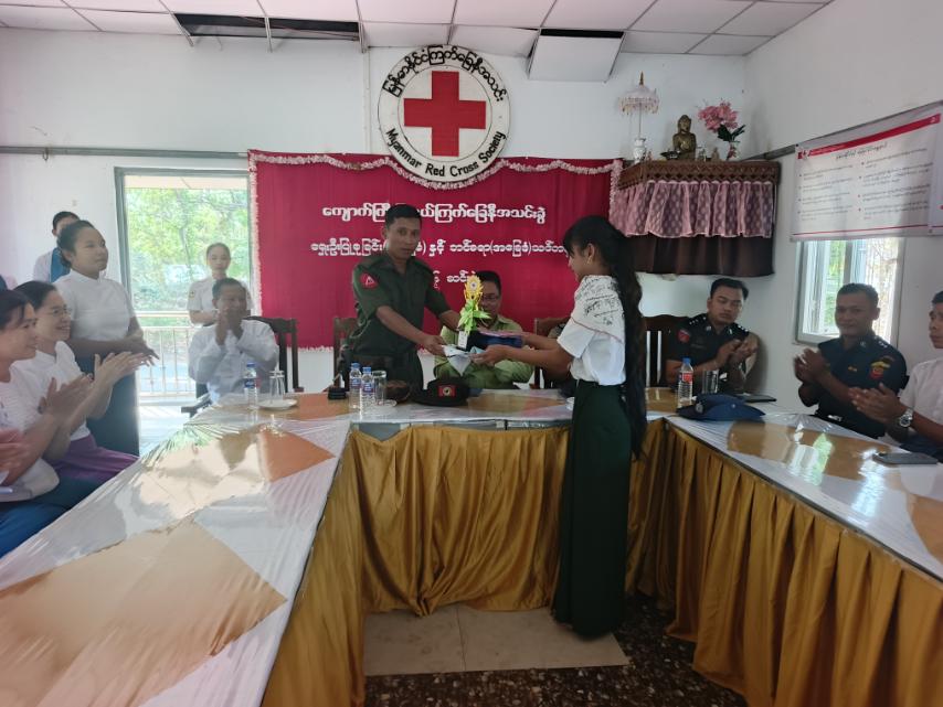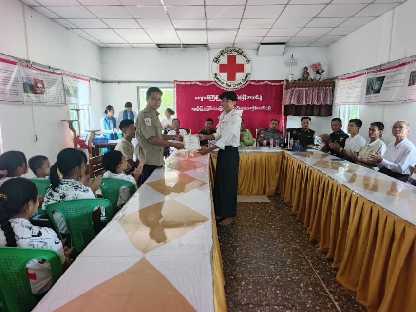 ဆက်လက်ပြီး အခြေခံဘင်ခရာသင်တန်းဆင်းလက်မှတ်အား မြို့နယ်စီမံခန့်ခွဲရေးနှင့် အုပ်ချုပ်ရေးကော်မတီဥက္ကဋ္ဌ ဦးဖြိုးဝေလင်းကလည်းကောင်း၊ ရှေးဦးပြုစုခြင်းအခြေခံသင်တန်းဆင်းလက်မှတ်များအား မြို့နယ်ကြက်ခြေနီအသင်းခွဲဥက္ကဋ္ဌ ဦးဝင်းမြင့်ကလည်းကောင်း သင်တန်းသူ/ သင်တန်းသားများ လက်သို့ပေးအပ်ကာ၊ သင်တန်းနှစ်ခုလုံးတွင် ထူးချွန်သူ သင်တန်းသူ/ သင်တန်းသားများနှင့် သင်တန်းပျက်ရက်အနည်းဆုံးသင်တန်း တက်ရောက်ခဲ့သူများအား သက်ဆိုင်ရာတာဝန်ရှိသူများက ဂုဏ်ပြုဆုများ အသီးသီးပေးအပ်ပြီး၊ မြို့နယ်ပညာရေးမှူး ဦီးခင်မောင်ထွေးက ကျေးဇူးတင်ဝမ်းမြောက် စကားပြန်လည်ပြောကြားခဲ့ကြောင်း သိရသည်။