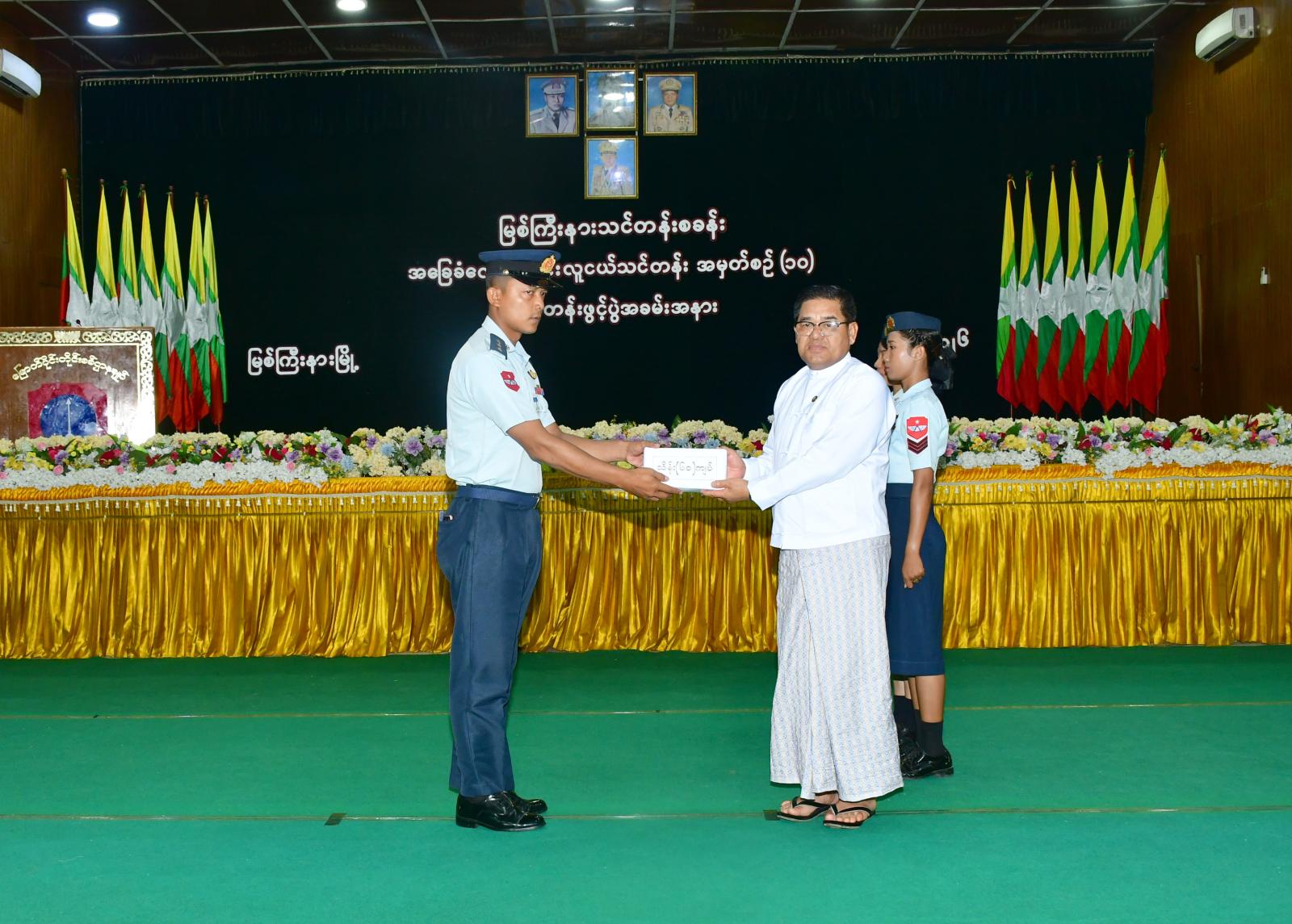 ထို့နောက် တိုင်းမှူးက သင်တန်းဖွင့်လှစ်ရခြင်း၏ ရည်ရွယ်ချက်များနှင့် သင်တန်းတက်ရောက် စဉ်ကာလအတွင်း အလေးထားလိုက်နာ၊ ကြိုးစားသင်ယူနိုင်ရေး ရှင်းလင်းပြောကြားပြီး ပြည်နယ် ဝန်ကြီးချုပ်က မြစ်ကြီးနားသင်တန်းစခန်းတွင် သင်တန်းသား/ သင်တန်းသူဦးရေ ၆၀ ဦးဖြင့် ဖွင့်လှစ် သွားမည့် အခြေခံလေကြောင်းလူငယ်သင်တန်းအတွက် ချီးမြှင့်ငွေကျပ်သိန်း ၆၀ ကို လည်းကောင်း၊ တိုင်းမှူးက သင်တန်းသား/ သင်တန်းသူများအတွက် သင်တန်းအထောက်အကူပြုပစ္စည်းများကို လည်းကောင်း၊ အလှူရှင်များက သင်တန်းအတွက် အလှူငွေများကို လည်းကောင်း မြစ်ကြီးနား လေတပ်စခန်းဌာနချုပ်ထံ ပေးအပ်ကြရာ ကျေးဇူးတင်ဂုဏ်ပြုမှတ်တမ်းလွှာများကို ပြန်လည်ပေးအပ် ခဲ့သည်။