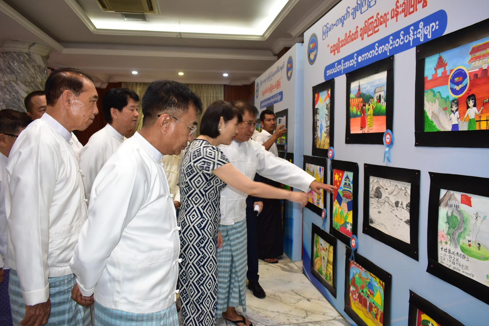 ဦးစွာ မြန်မာ-တရုတ်ချစ်ကြည်ရေးအထိမ်းအမှတ် “ဆွေမျိုးပေါက်ဖော် ချစ်ကြည်ရေး” ဓာတ်ပုံနှင့်ပန်းချီပြိုင်ပွဲ ဆုချီးမြှင့်ပွဲ ဖွင့်ပွဲအခမ်းအနားအား သက်ဆိုင်ရာတာဝန်ရှိသူများက ဖဲကြိုးဖြတ်ဖွင့်လှစ်ပေးခဲ့ကြပြီး မန္တလေးတိုင်းဒေသကြီးအစိုးရအဖွဲ့ လူမှုရေးရာဝန်ကြီး ဦးလှကြွယ်က အဖွင့်အမှာစကားပြောကြားခြင်း၊ မန္တလေးမြို့အခြေစိုက် တရုတ်ပြည်သူ့သမ္မတနိုင်ငံကောင်စစ်ဝန်ချုပ်ရုံးမှ တရုတ်ကောင်စစ်ဝန်ချုပ် Ms.Gao Ping က အမှာစကား ထပ်မံပြောကြားသည်။