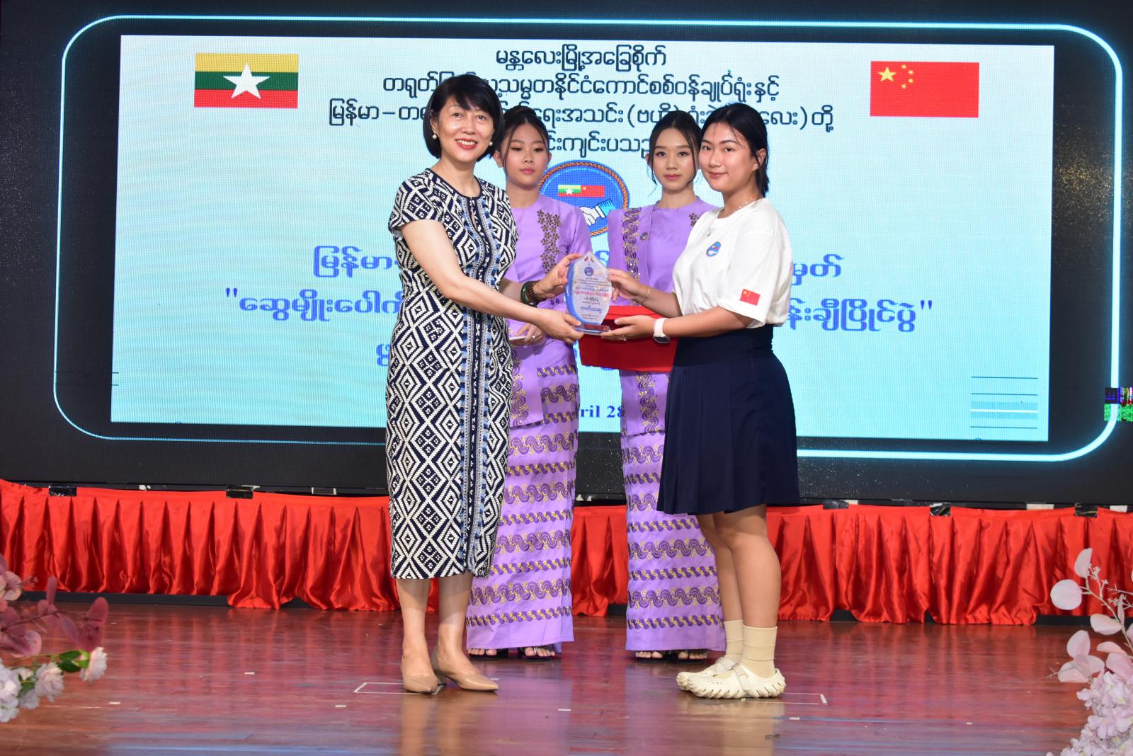 ဆက်လက်ပြီး မြန်မာ-တရုတ်ချစ်ကြည်ရေးအထိမ်းအမှတ် “ဆွေမျိုးပေါက်ဖော် ချစ်ကြည်ရေး” ဓာတ်ပုံနှင့် ပန်းချီပြိုင်ပွဲများတွင် ဆုရရှိသူများနှင့် အကဲဖြတ်ပေးခဲ့ကြသော ဒိုင်လူကြီးမင်းများအား အမှတ်တရ ဂုဏ်ပြုလက်ဆောင်များနှင့် ဆုများအား ထိုက်တန်စွာ ပေးအပ်ချီးမြှင့်ခဲ့ကြောင်း သိရသည်။