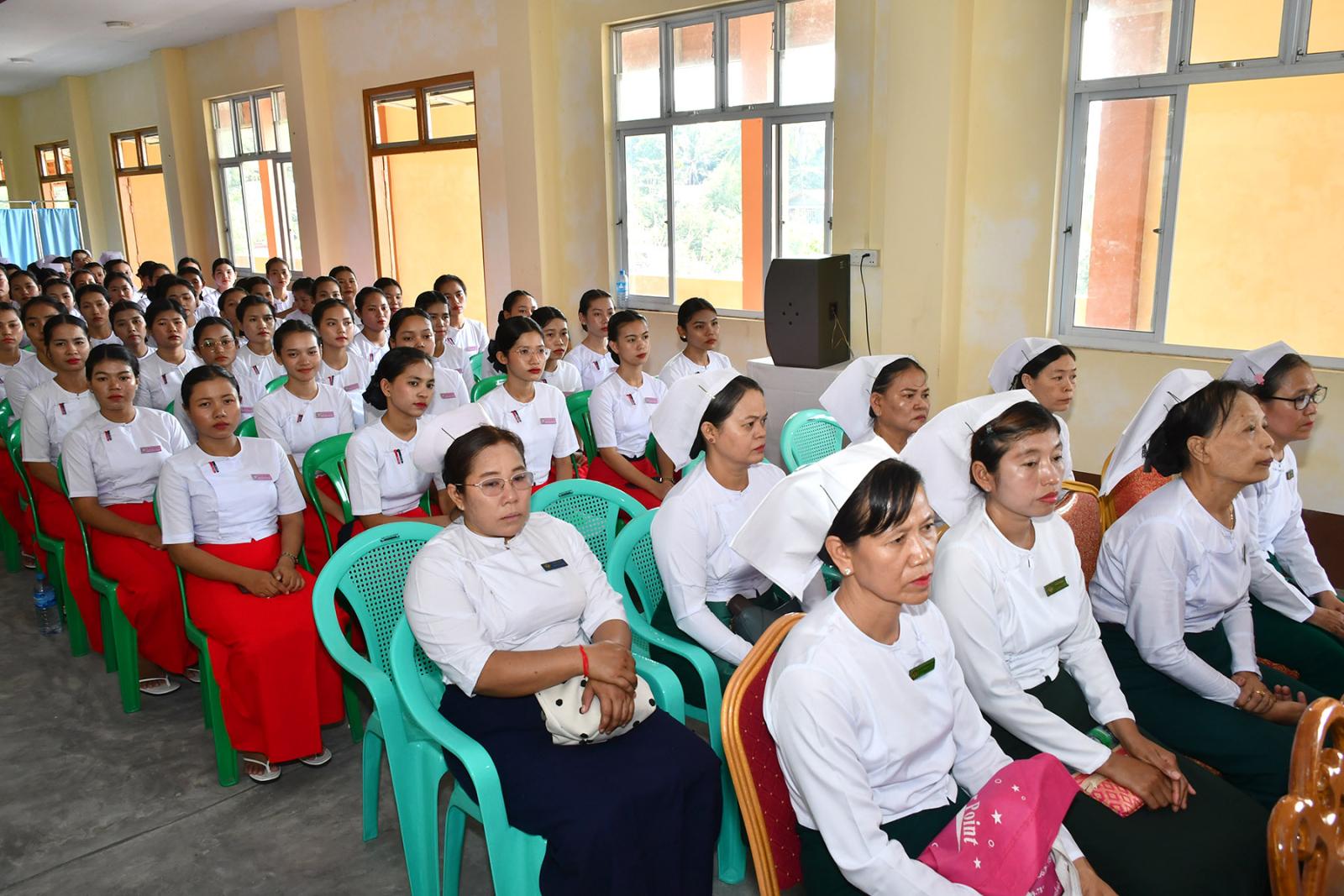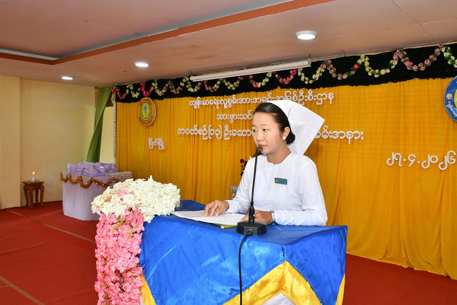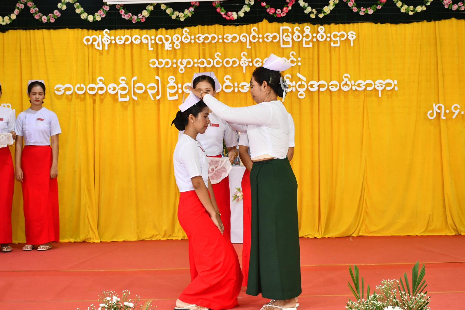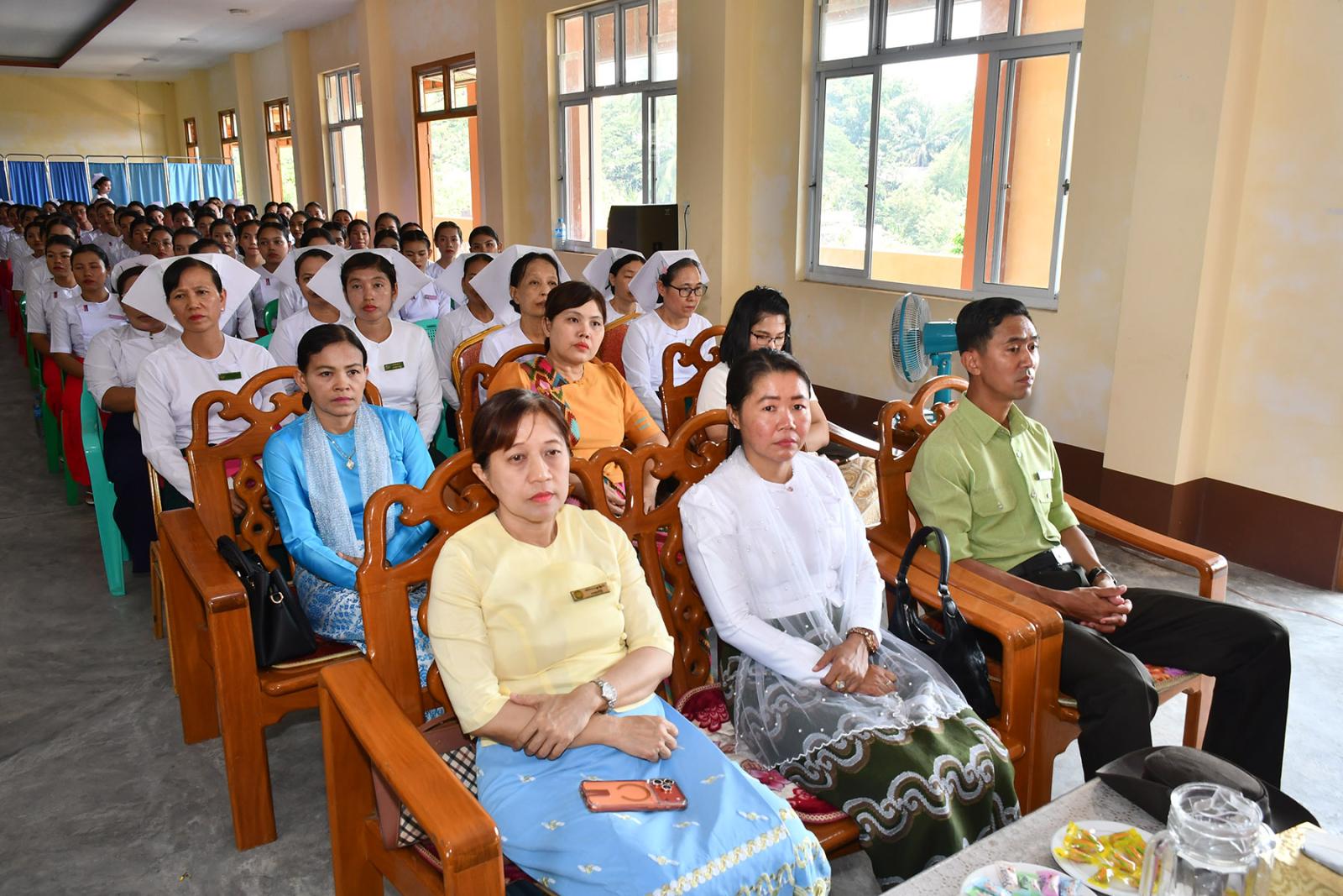 ဆက်လက်၍ သင်တန်းသူများက လက်ဆင့်ကမ်း ဆီမီးတိုင်များကို ထွန်းညှိ၍ သူနာပြု သစ္စာအဓိဌာန် ရွတ်ဆိုခဲ့ကြကာ ပထမနှစ်ဘက်စုံသားဖွားဒီပလိုမာသင်တန်းသူများမှ “ ဂရုဏာအလင်း ” သီချင်းဖြင့် သီဆိုဂုဏ်ပြု ၍ သင်တန်းသူများကိုယ်စား သင်တန်းသူ တစ်ဦးမှ ကျေးဇူးတင်စကားပြန်လည်ပြောကြားပြီး ဒုတိယနှစ် ဘက်စုံသားဖွားဒီပလိုမာသင်တန်းသူများမှ “ ပြည်သူချစ်တဲ့ သားဖွားဆရာမများ ” သီချင်းဖြင့် သီဆိုဂုဏ်ပြုကြကြောင်း သိရသည်။