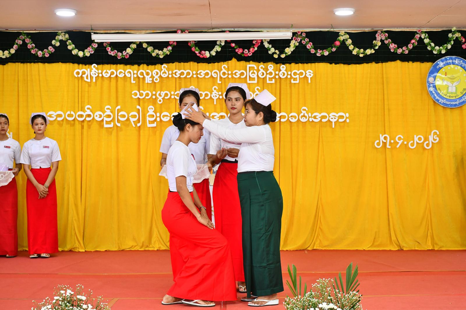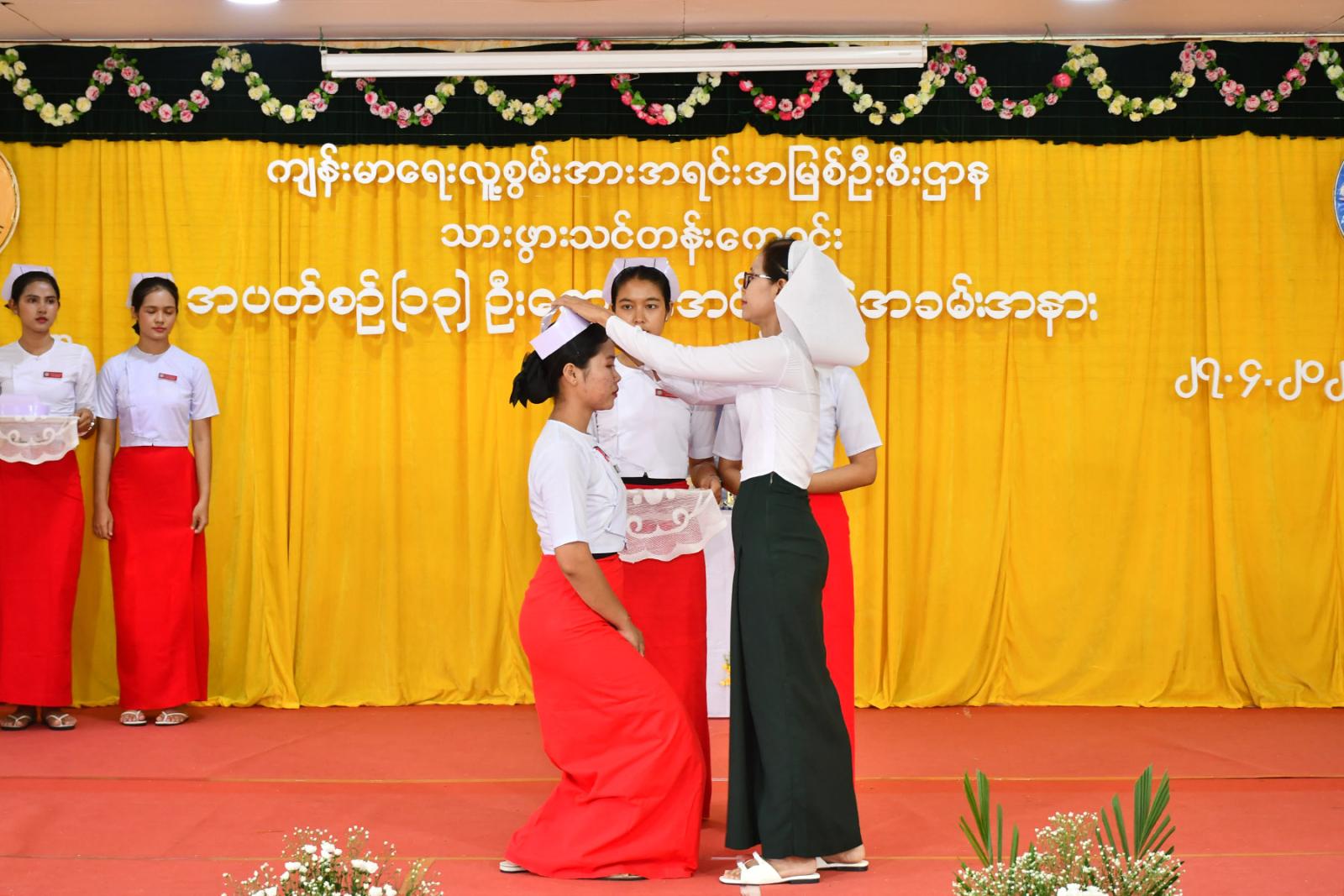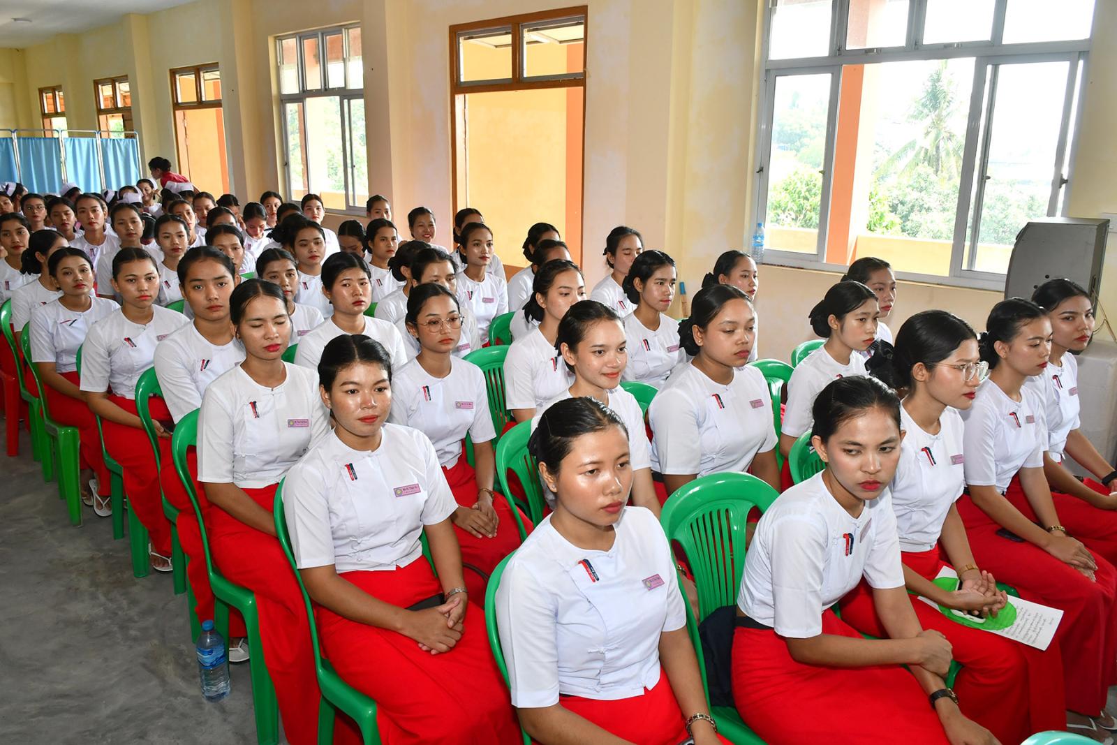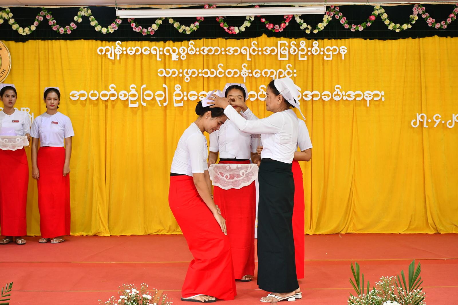 ဆက်လက်၍ သင်တန်းသူများက လက်ဆင့်ကမ်း ဆီမီးတိုင်များကို ထွန်းညှိ၍ သူနာပြု သစ္စာအဓိဌာန် ရွတ်ဆိုခဲ့ကြကာ ပထမနှစ်ဘက်စုံသားဖွားဒီပလိုမာသင်တန်းသူများမှ “ ဂရုဏာအလင်း ” သီချင်းဖြင့် သီဆိုဂုဏ်ပြု ၍ သင်တန်းသူများကိုယ်စား သင်တန်းသူ တစ်ဦးမှ ကျေးဇူးတင်စကားပြန်လည်ပြောကြားပြီး ဒုတိယနှစ် ဘက်စုံသားဖွားဒီပလိုမာသင်တန်းသူများမှ “ ပြည်သူချစ်တဲ့ သားဖွားဆရာမများ ” သီချင်းဖြင့် သီဆိုဂုဏ်ပြုကြကြောင်း သိရသည်။