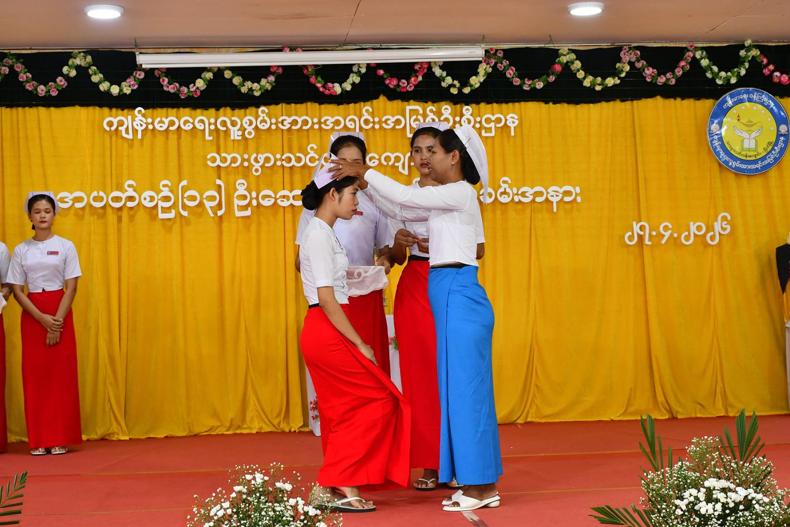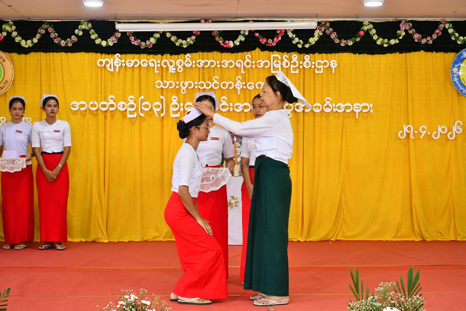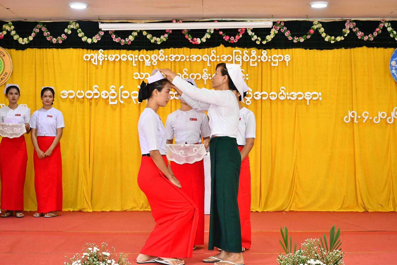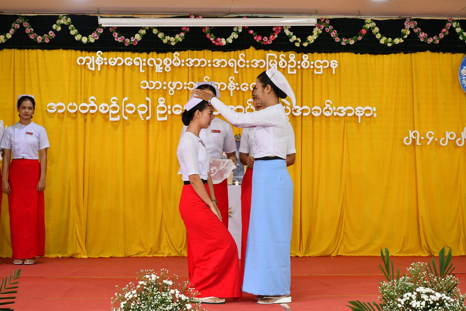 ဆက်လက်၍ သင်တန်းသူများက လက်ဆင့်ကမ်း ဆီမီးတိုင်များကို ထွန်းညှိ၍ သူနာပြု သစ္စာအဓိဌာန် ရွတ်ဆိုခဲ့ကြကာ ပထမနှစ်ဘက်စုံသားဖွားဒီပလိုမာသင်တန်းသူများမှ “ ဂရုဏာအလင်း ” သီချင်းဖြင့် သီဆိုဂုဏ်ပြု ၍ သင်တန်းသူများကိုယ်စား သင်တန်းသူ တစ်ဦးမှ ကျေးဇူးတင်စကားပြန်လည်ပြောကြားပြီး ဒုတိယနှစ် ဘက်စုံသားဖွားဒီပလိုမာသင်တန်းသူများမှ “ ပြည်သူချစ်တဲ့ သားဖွားဆရာမများ ” သီချင်းဖြင့် သီဆိုဂုဏ်ပြုကြကြောင်း သိရသည်။