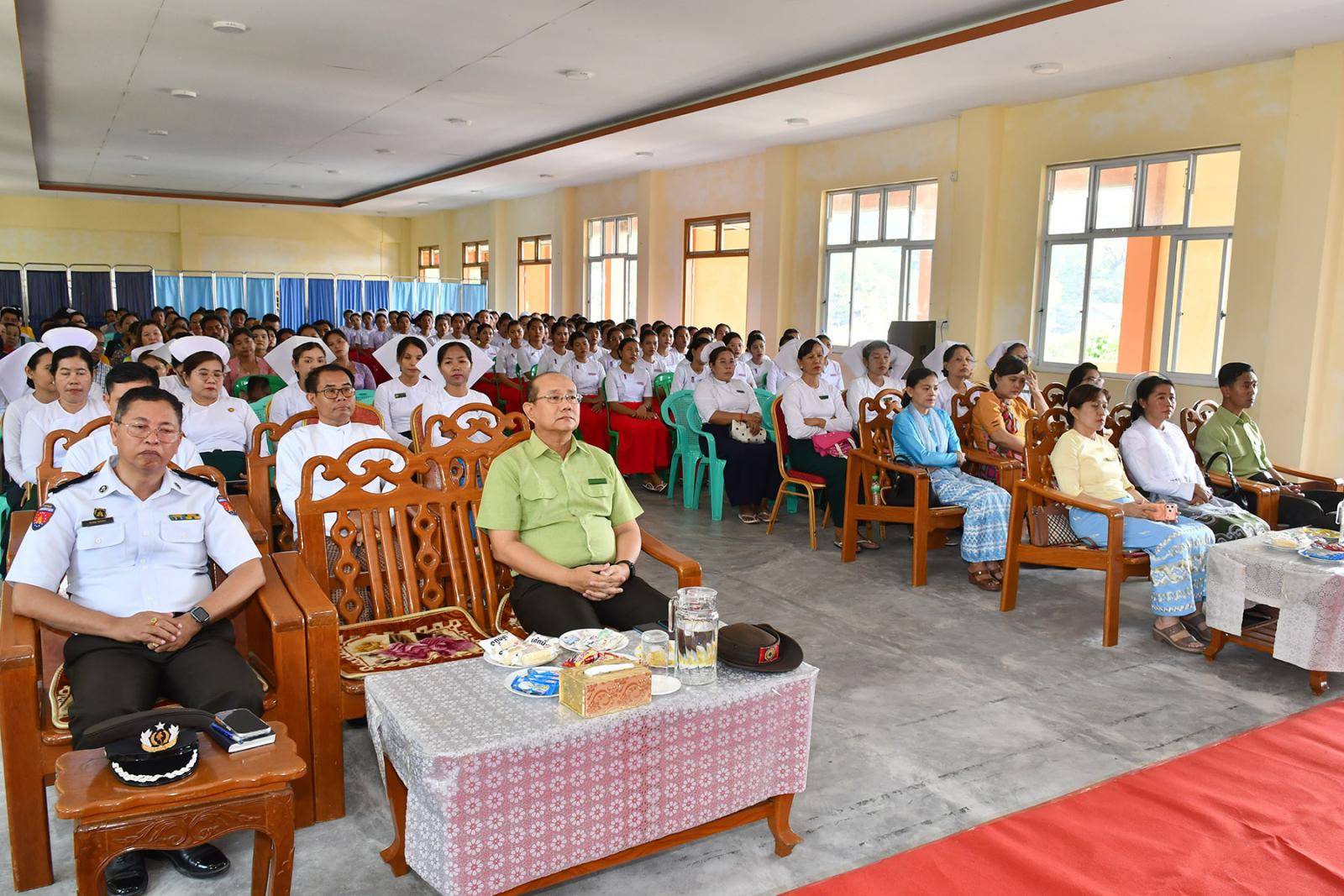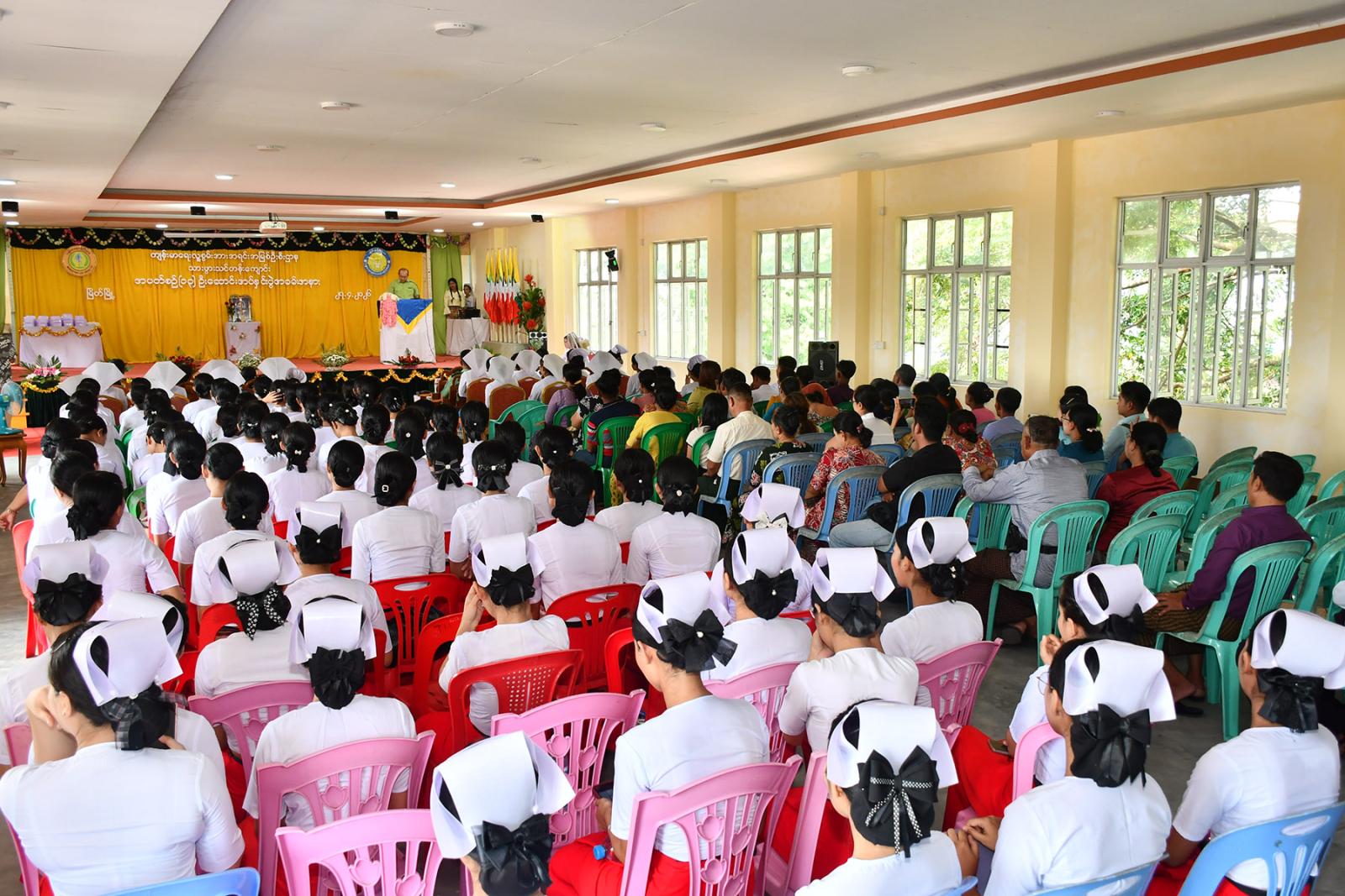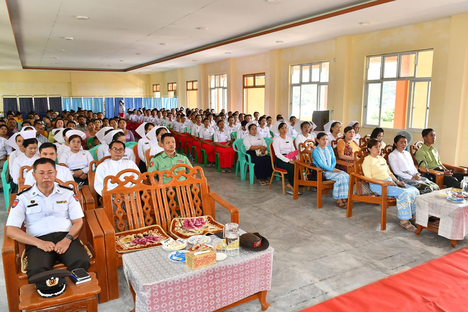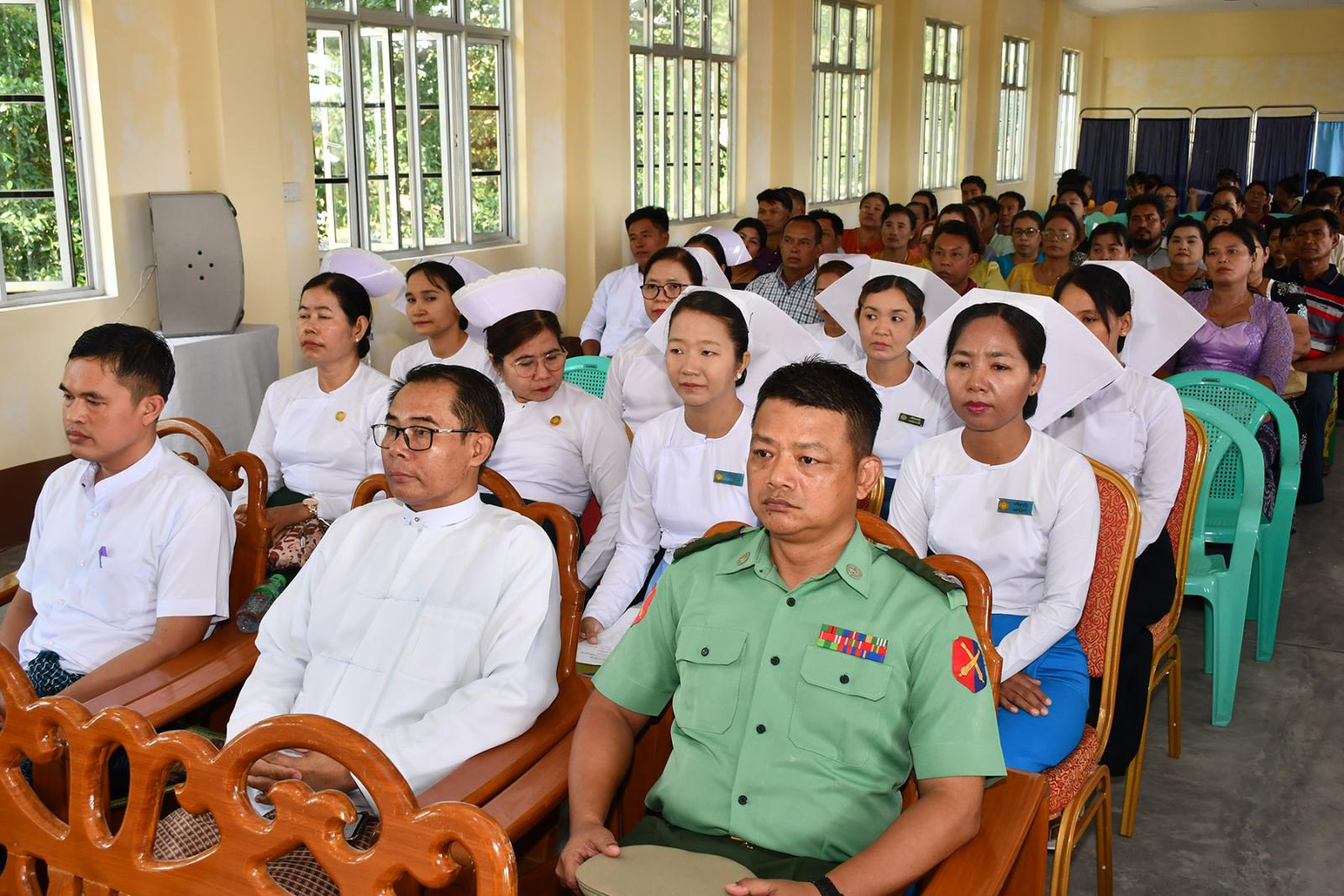 ဆက်လက်၍ သင်တန်းသူများက လက်ဆင့်ကမ်း ဆီမီးတိုင်များကို ထွန်းညှိ၍ သူနာပြု သစ္စာအဓိဌာန် ရွတ်ဆိုခဲ့ကြကာ ပထမနှစ်ဘက်စုံသားဖွားဒီပလိုမာသင်တန်းသူများမှ “ ဂရုဏာအလင်း ” သီချင်းဖြင့် သီဆိုဂုဏ်ပြု ၍ သင်တန်းသူများကိုယ်စား သင်တန်းသူ တစ်ဦးမှ ကျေးဇူးတင်စကားပြန်လည်ပြောကြားပြီး ဒုတိယနှစ် ဘက်စုံသားဖွားဒီပလိုမာသင်တန်းသူများမှ “ ပြည်သူချစ်တဲ့ သားဖွားဆရာမများ ” သီချင်းဖြင့် သီဆိုဂုဏ်ပြုကြကြောင်း သိရသည်။