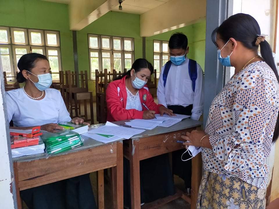 ကျောင်းအပ်နှံရာတွင် ကိုဗစ်-၁၉ ရောဂါ ကာကွယ်ရေးစည်းကမ်းချက်များနှင့်အညီ ဖွင့်လှစ်နိုင်ရန်ပြင်ဆင် ထားရှိပြီး ကျောင်းသားကျောင်းသူများ၏ ကျောင်းဝင်ခွင့်လျှောက်လွှာပုံစံ ဖြည့်စွက်ခြင်း၊ ကျောင်း၏ စည်းကမ်းချက်များအား ကျောင်းသား/မိဘများ လိုက်နာကြစေရန် ကျောင်းအုပ်ကြီးနှင့် သက်ဆိုင်ရာ အတန်းအလိုက် ဆရာ/ဆရာမများမှ ဆွေးနွေးပြောကြားပြီး မိဘအုပ်ထိန်းသူများကိုယ်တိုင် လက်မှတ်ရေးထိုးကျောင်းအပ်နှံပေးခဲ့ကြသည်။