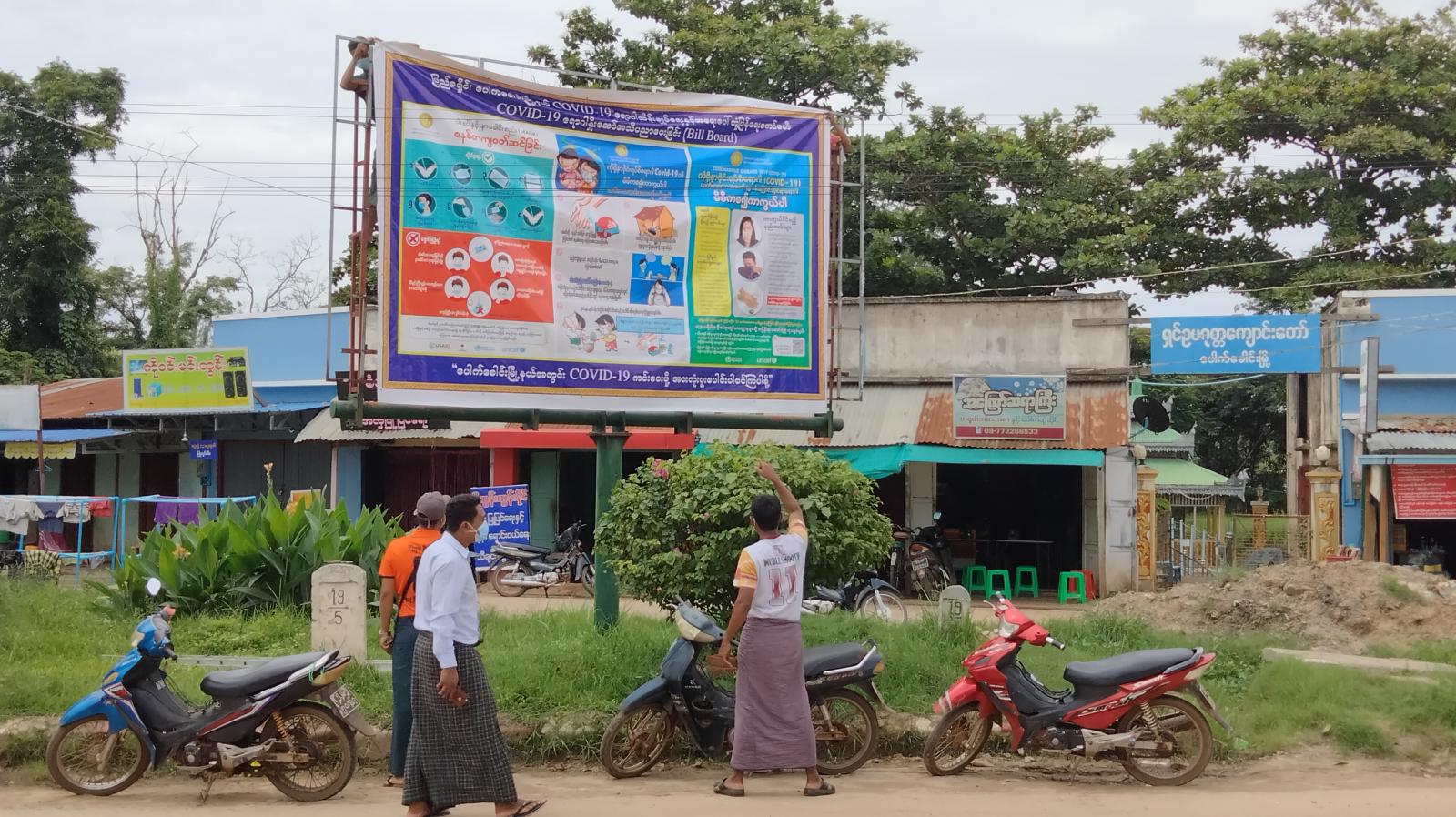 မြေစိုက်ပိုစတာတွင် ကျန်းမာရေးဝန်ကြီးဌာန၏ လမ်းညွှန်ချက်များဖြစ်သော အိမ်အပြင်ထွက်လျှင် ပါးစပ်နှင့် နှာခေါင်းစည်း(mask)၊ Face Shield တို့ကို စနစ်တကျတပ်ဆင်ရန်၊ တစ်ဦးနှင့်တစ်ဦး တတ်နိုင်သမျှ ခပ်ခွာခွာ နေထိုင်ရန်၊ လက်ကို စက္ကန့် ၂၀ ကြာ မကြာခဏ စနစ်တကျ ဆေးကြောရန်၊ ကိုယ်ပူခြင်း၊ ချောင်းဆိုးခြင်း၊ အသက်ရှူကြပ်ခြင်း၊ အားအင်ကုန်ခမ်းခြင်း၊ ရုတ်တရက် အနံ့အရသာ ပျောက်ဆုံးခြင်း လက္ခဏာများ ပေါ်ပေါက်ပါက နီးစပ်ရာ ကျန်းမာရေးဌာနတွင် အမြန်ဆုံး ကုသမှု ခံယူရန် စသည့် ကိုဗစ်-၁၉ ရောဂါ ကာကွယ်ရေး နည်းလမ်းများကို ပြည်သူများ ဖတ်ရှုလေ့လာပြီး ကျယ်ကျယ်ပြန့်ပြန့် သိရှိလိုက်နာလာစေရန်အတွက် စိုက်ထူပေးခဲ့ခြင်း ဖြစ်ကြောင်း သိရသည်။