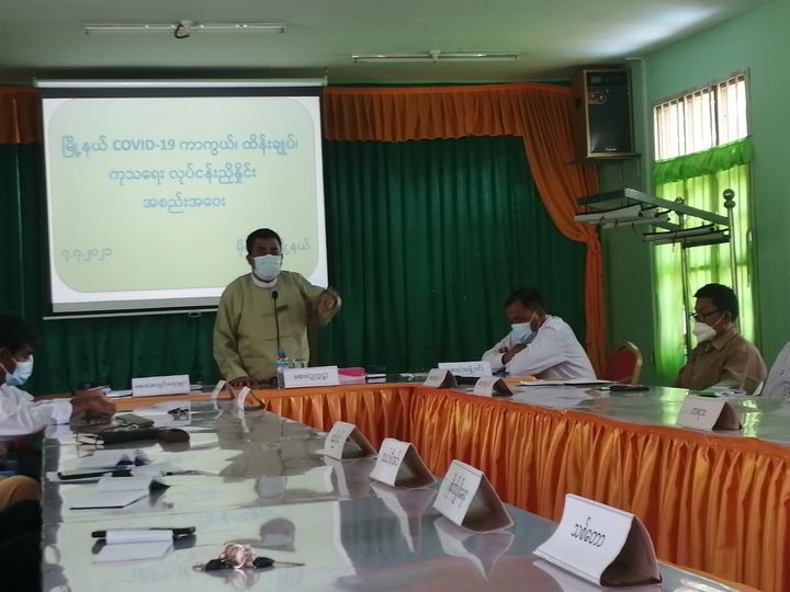 အစည်းအဝေးတွင် မြို့နယ် ကိုဗစ်-၁၉ ရောဂါ ထိန်းချုပ်ကာကွယ်ရေးနှင့် အရေးပေါ်တုံ့ပြန်ရေး ကော်မတီ ဥက္ကဋ္ဌ၊ မြို့နယ်အုပ်ချုပ်ရေးမှူး ဦးအောင်စိုးဦး က ကိုဗစ်-၁၉ ရောဂါ တတိယလှိုင်းဖြစ်ပွားမှု၊ ကူးစက်ပြန့်ပွားမှုအခြေအနေနှင့် ပတ်သက်၍ မြို့နယ်အတွင်း ရောဂါထိန်းချုပ်ကာကွယ်ကုသရေးလုပ်ငန်းများ အရှိန်အဟုန်မြှင့်တင် ဆောင်ရွက်နိုင်ရန်အတွက် ဖြတ်သန်းသွားလာမည့် ယာဉ်များ၊ ရပ်ဝေးမှပြန်လာမည့်သူများအား စစ်ဆေးကြပ်မတ်နိုင်ရန် မြို့ဝင်မြို့ထွက် စစ်ဆေးရေးဂိတ်များဖြင့် စနစ်တကျ တာဝန်ချထား စစ်ဆေးနိုင်ရေး၊ သတ်မှတ်ထားသော Quarantine Center များကို Community Based Facility Quarantine Center အဖြစ် အဆင့်မြှင့်တင်ဆောင်ရွက်ထားရှိကာ ရောဂါပိုး ပြန့်ပွားမှုမရှိစေရေး ထိန်းသိမ်းကြပ်မတ်နိုင်စေရန်၊ Isolution Ward တွင် ဝင်ရောက်နေသော လူနာများအား ကိုယ်ခံအားပြည့်ဝကာ ပြန်လည်ကျန်းမာလာစေရေးအတွက် အစာအဟာရများ ကျွေးမွေး၍ လိုအပ်သည့် အသုံးအဆောင်များ ဖြည့်ဆည်းပေးနိုင်ရန်၊ အရေးပေါ်တုံ့ပြန်ရေး လုပ်ငန်းများအတွက် ကြိုတင်စီမံမှုများ ဆောင်ရွက်နိုင်ရန်တို့ကို ချပြဆွေးနွေးခဲ့ရာ တက်ရောက်လာကြသော မြို့မိမြို့ဖများ၊ မြို့နယ်အဆင့်ဌာနဆိုင်ရာများ၊ ရပ်ကွက်နှင့် ကျေးရွာအုပ်စု အုပ်ချုပ်ရေးမှူးများ က အသီးသီးပြန်လည်ဆွေးနွေးခဲ့ကြပြီး ဆုံးဖြတ်ချက်များ ချမှတ်ကာ လုပ်ငန်းများ လျင်မြန်အောင်မြင်စွာ အကောင်အထည်ဖော် ဆောင်ရွက်နိုင်ရေးအတွက် ကိုဗစ်-၁၉ ရောဂါ ထိန်းချုပ်ကာကွယ်ကုသရေး မတည်ရန်ပုံငွေအဖြစ် အလှူငွေများ အသီးသီးထည့်ဝင် လှူဒါန်းခဲ့ကြကြောင်း သိရသည်။