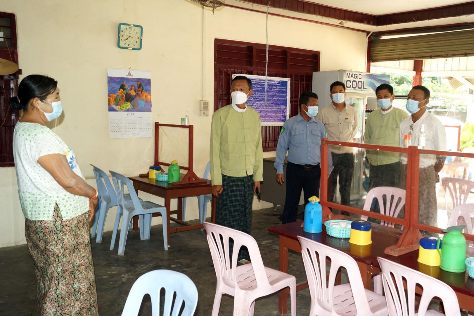 ထိုသို့ ကွင်းဆင်းစစ်ဆေးရာတွင် ခရိုင်ကိုဗစ်-၁၉ ရောဂါကြိုတင်ကာကွယ်ထိန်းချုပ်ရေးနှင့် အရေး ပေါ်တုံ့ပြန်ရေးကော်မတီဥက္ကဋ္ဌ ခရိုင်စီမံအုပ်ချုပ်ရေးအဖွဲ့ဥက္ကဋ္ဌ ဦးအောင်ဟိန်းကျော်နှင့် ကော်မတီ ဝင်များက ယာယီပျံကျဈေးအတွင်း ဈေးရောင်းချလျက်ရှိသည့်ဈေးသည်များနှင့် ဈေးဝယ်လာသူများ Mask တပ်ဆင်ခြင်းရှိ မရှိစစ်ဆေးခြင်း၊ အောင်လ္ဘက်ရည်ဆိုင်၊ ရွှေစကားလ္ဘက်ရည်ဆိုင်၊ သဇင် လ္ဘက် ရည်ဆိုင်၊ ကျိုင်းတုံ စားသောက်ဆိုင်၊ စိန်ပန်းပြာစားသောက်ဆိုင်နှင့် SO GOOD စားသောက်များသို့ သွားရောက်၍ ဆိုင်ရှေ့တွင် လက်ဆေးဘေစင်နှင့် လက်သန့်ဆေးရည်များ ထားရှိခြင်းရှိ မရှိ၊ ကိုယ်အပူချိန်တိုင်း ကိရိယာများ ထားရှိစစ်ဆေးခြင်းရှိ မရှိ၊ ကိုဗစ်-၁၉ရောဂါ ကျန်းမာရေးအသိ ပညာပေးပိုစတာများကို Customer များမြင်သာ သည့်နေရာများတွင်ကပ်ထားခြင်း ရှိ၊ မရှိ၊ စားပွဲခုံ များ ခင်းကျင်းထားရာတွင် Social Distancing နှင့်အညီ ဆောင်ရွက်ထားခြင်း ရှိ မရှိ၊ ဆိုင်ပိုင်ရှင်များ အနေဖြင့် နှာခေါင်းစည်း(Mask)၊ မျက်နှာကာ(Face shield)များ တပ်ဆင်ရောင်းချခြင်း ရှိ၊မရှိ စသည် တို့ကို ကြည့်ရှုစစ်ဆေးခဲ့ကြသည်။