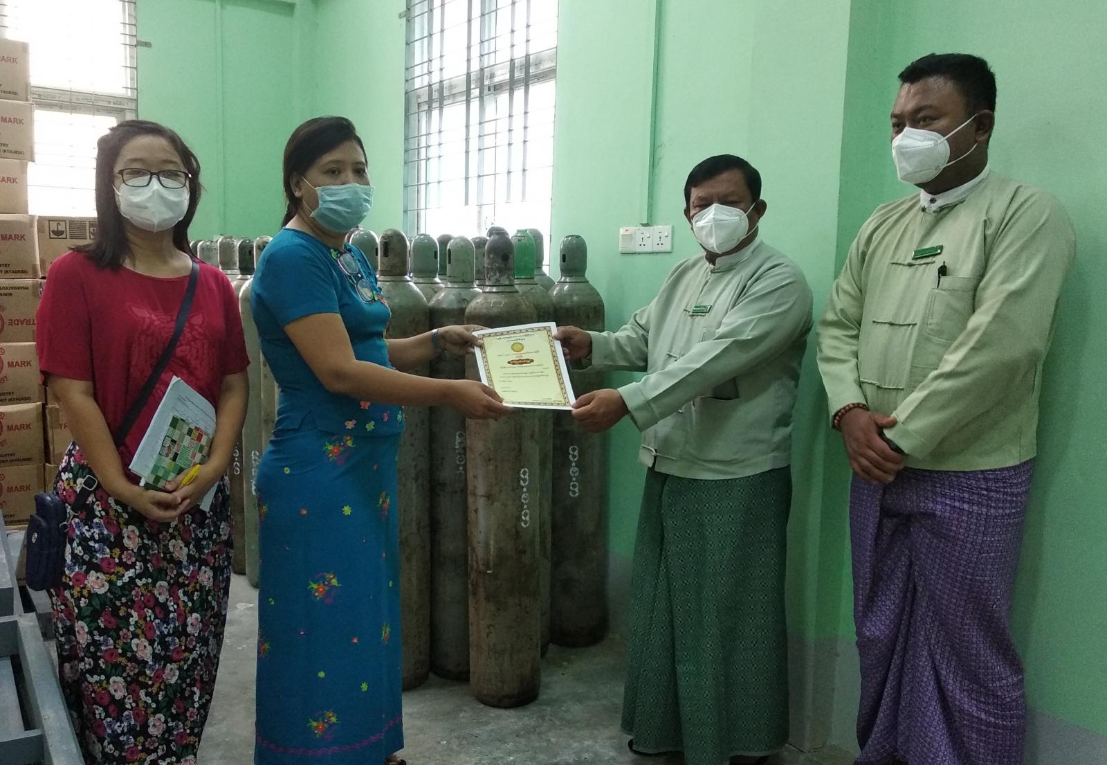 အဆိုပါ အောက်စီဂျင်အိုးကြီး အလုံး(၅၀)ကို ပဲခူးတိုင်းဒေသကြီးစီမံအုပ်ချုပ်ရေးကောင်စီ ဥက္ကဋ္ဌ ကိုယ်စား ပြည်ခရိုင်စီမံအုပ်ချုပ်ရေးအဖွဲ့ဥက္ကဋ္ဌ ဦးသိန်းအောင် နှင့် မြို့နယ်စီမံအုပ်ချုပ်ရေးအဖွဲ့ဥက္ကဋ္ဌ ဦးနိုင်လင်းဦးတို့က ပြည်သူ့ဆေးရုံကြီး ဆေးသိုလှောင်ရေးဌာန၌ ယနေ့ နံနက်ပိုင်းက လာရောက်လှူဒါန်းရာ ဒုတိယဆေးရုံအုပ်ကြီး ဒေါက်တာသီတာစိုးက လက်ခံခဲ့ပြီး ဂုဏ်ပြုမှတ်တမ်းလွှာ ပြန်လည်ပေးအပ်ခဲ့ကြောင်း ဆေးရုံကြီးတာဝန်ရှိသူများ ထံမှ သိရသည်။