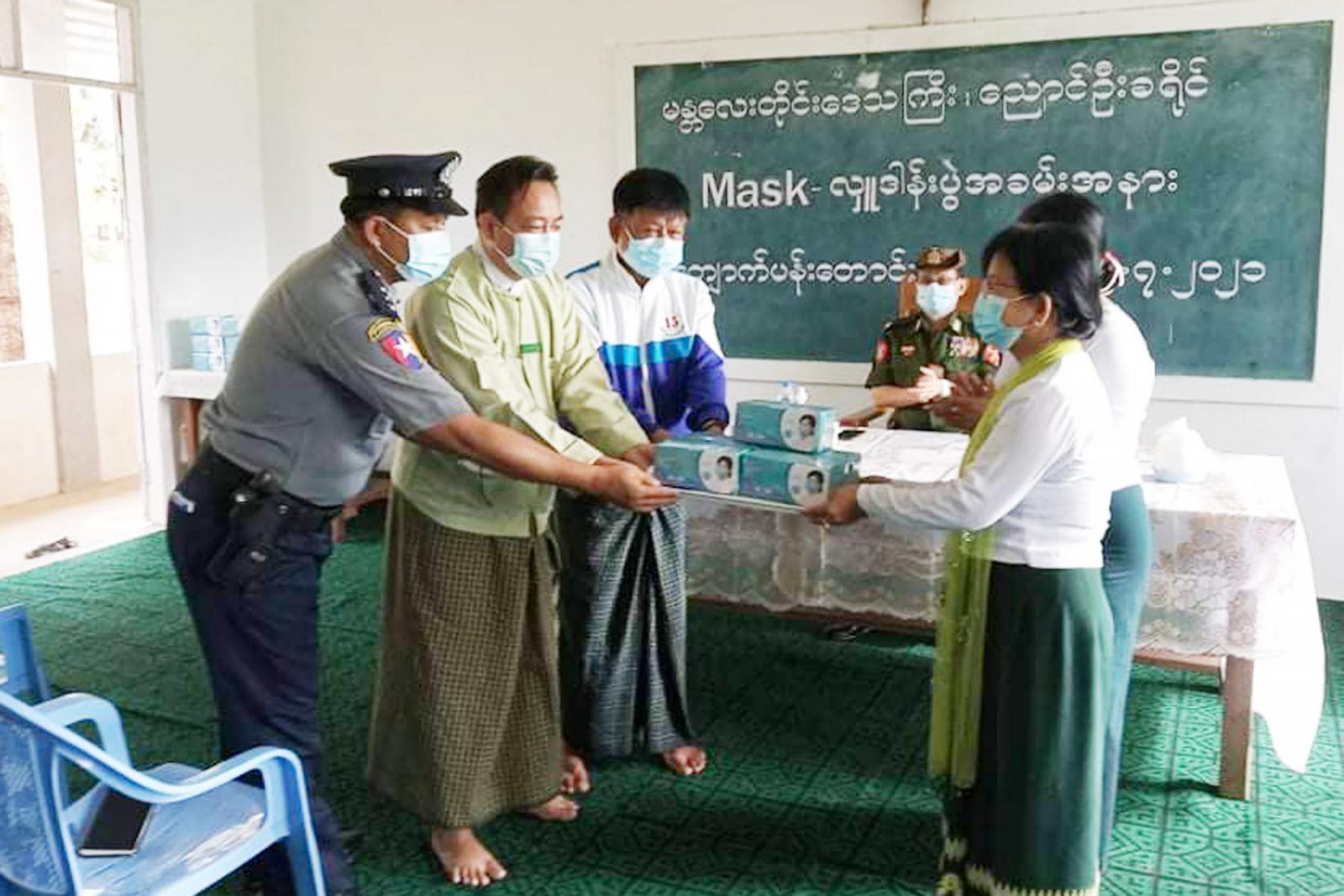 အခမ်းအနားတွင် ကျောက်ပန်းတောင်း တပ်နယ်မှူး ဗိုလ်မှူးချုပ် ကျော်ကျော်က တစ်ခါသုံး နှာခေါင်းစည်း (Mask)များ ပေးအပ်လှူဒါန်းရခြင်း နှင့်ပတ်သက်၍ ရှင်းလင်းပြောကြားပြီး၊ တပ်မတော်မိသားစုများမှ ပေးအပ် လှူဒါန်းသည့် Mask အခုရေ(၂၀၀၀)ကို တပ်နယ်မှူး ဗိုလ်မှူးချုပ် ကျော်ကျော်က လည်းကောင်း၊ မြို့နယ် စီမံအုပ်ချုပ်ရေးအဖွဲ့မှ ပေးအပ်လှူဒါန်းသည့် Mask အခုရေ(၁၀၀၀)ကို မြို့နယ်စီမံ အုပ်ချုပ်ရေးအဖွဲ့ဥက္ကဋ္ဌ နှင့်အဖွဲ့ဝင်များက လည်းကောင်း ပေးအပ်လှူဒါန်းရာ၊ မြို့နယ်ပညာရေးမှူး ဒေါ်မော်မော်က လက်ခံရယူပြီး၊ ကျေးဇူးတင်စကား ပြန်လည် ပြောကြားခဲ့ကြောင်း သိရသည်။