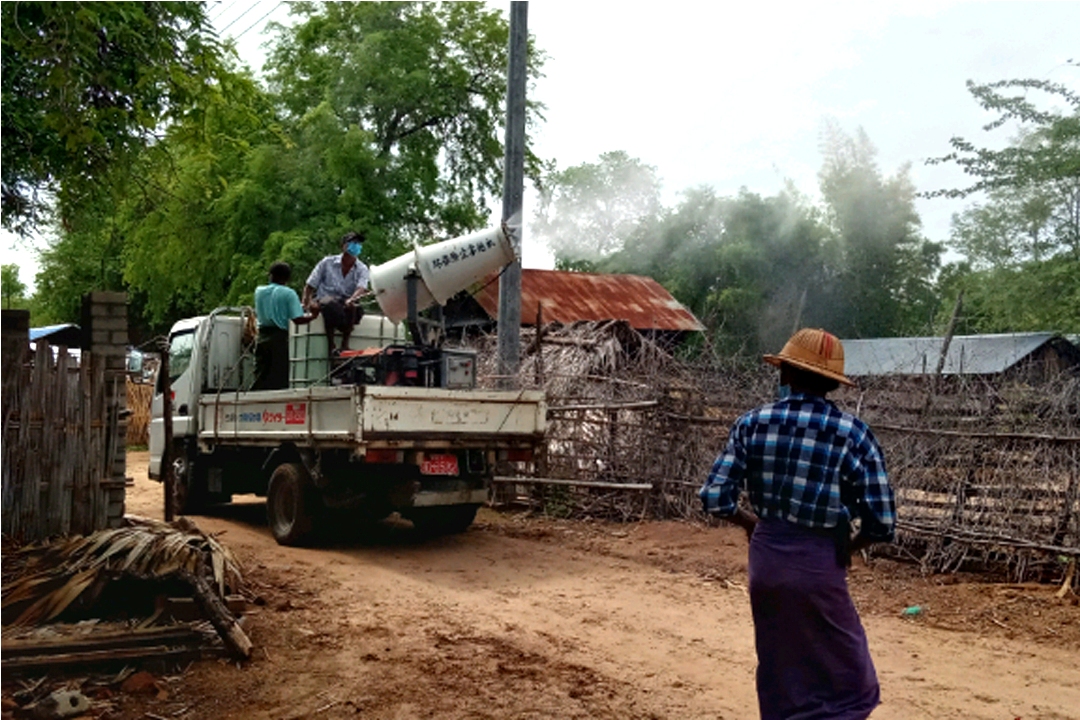 အဆိုပါနေ့က ဆေးဖျန်းအဖွဲ့ နာယကများဖြစ်ကြသော ဦးကျောက်ခဲ၊ ဦးစောထွန်း၊ မေတ္တာရှင်အဖွဲ့ဥက္ကဋ္ဌ ဒေါက်တာ သက်အောင်သန်းနှင့် တာဝန်ရှိသူများက ဦးဆောင်၍ ဆေးဖျန်းအမြှောက်စက်ကြီးဖြင့် Quarantine ဖွင့်လှစ်ထားသည့် ကျန်းမာရေးဆေးခန်း၊ ပိုးတွေ့လူနာအိမ်၊ စာသင်ကျောင်း၊ ဘုန်းတော်ကြီးကျောင်း၊ ရွာလယ်လမ်းမ၊ လမ်းသွယ်နှင့် လမ်းကြာများပါမကျန် လှည့်လည်၍ ပိုးသတ်ဆေးများဖျန်းခြင်း လုပ်ငန်းများ ဆောင်ရွက်ခဲ့ကြသည်။