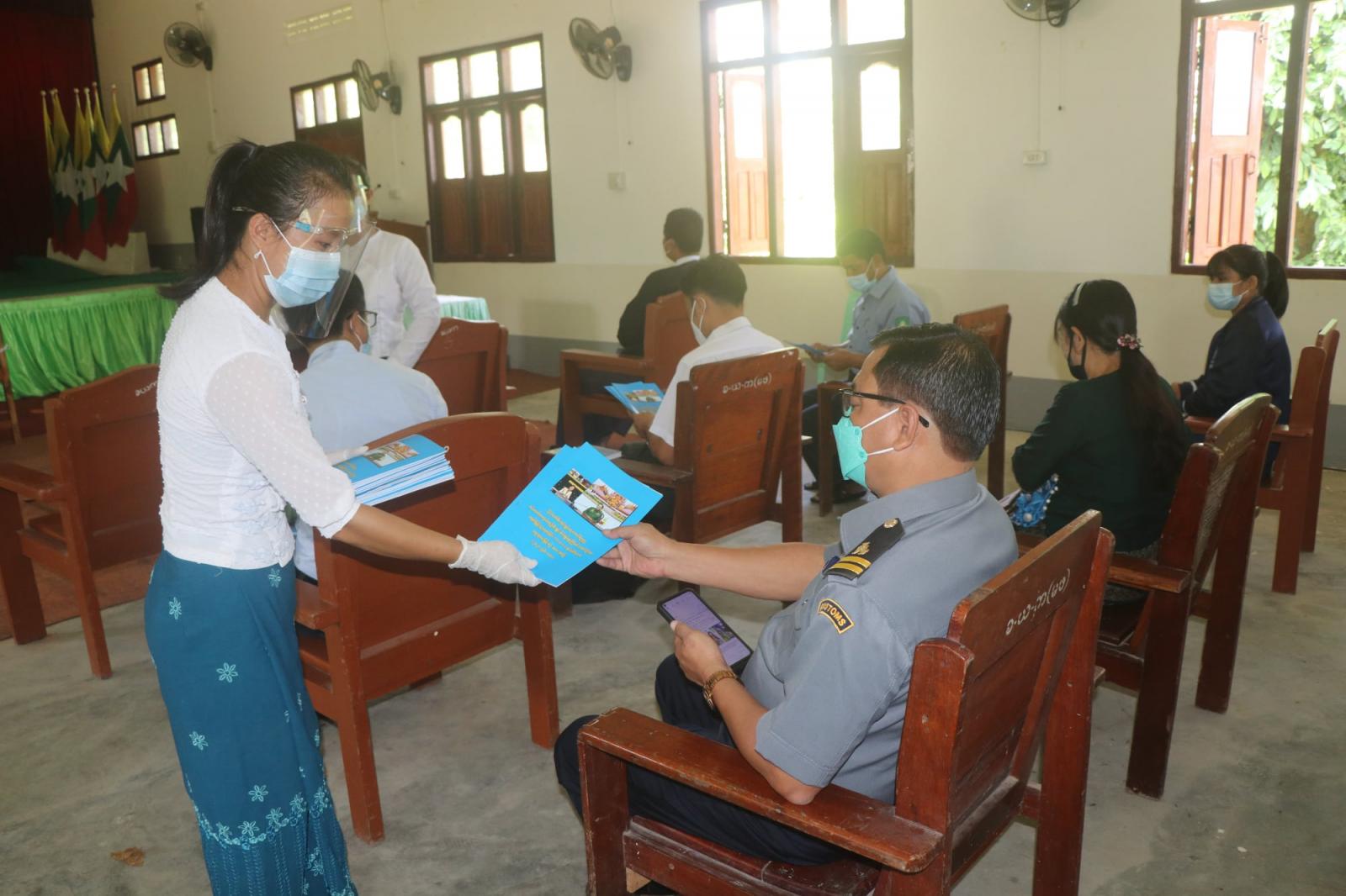 ထိုသို့ အသိပညာပေးလုပ်ငန်းများဆောင်ရွက်ရာတွင် မြို့နယ်ပြန်ကြားရေးနှင့်ပြည်သူ့ဆက်ဆံရေး ဦးစီးဌာနမှ စာကြည့်တိုက်လက်ထောင်-၃ ဒေါ်နန်းကောင်ခမ်းနှင့်ဝန်ထမ်းများက ပြည်ထောင်စုလမ်းမကြီး ပေါ် ဖြတ်သန်းသွားလာနေကြသည့် မိဘပြည်သူများကို ပြန်ကြားရေးနှင့်ပြည်သူ့ဆက်ဆံရေးဦးစီးဌာန က ထုတ်ဝေသည့် COVID-19 မပြန့်ပွားဖို့ မိမိက၍ကာကွယ်စို့ သတင်းစကား လက်ကမ်းစာစောင်များ၊ မိသားစုအတွက် COVID-19အချက်အလက်များ စသည့်အသိပညာပေးလက်ကမ်းစာစောင်များကို ဖြန့်ဝေ ခြင်း၊ နှာခေါင်းစည်း(Mask)မပါသူများကို နှာခေါင်းစည်းများဖြန့်ဝေပေးခဲ့သည်။
