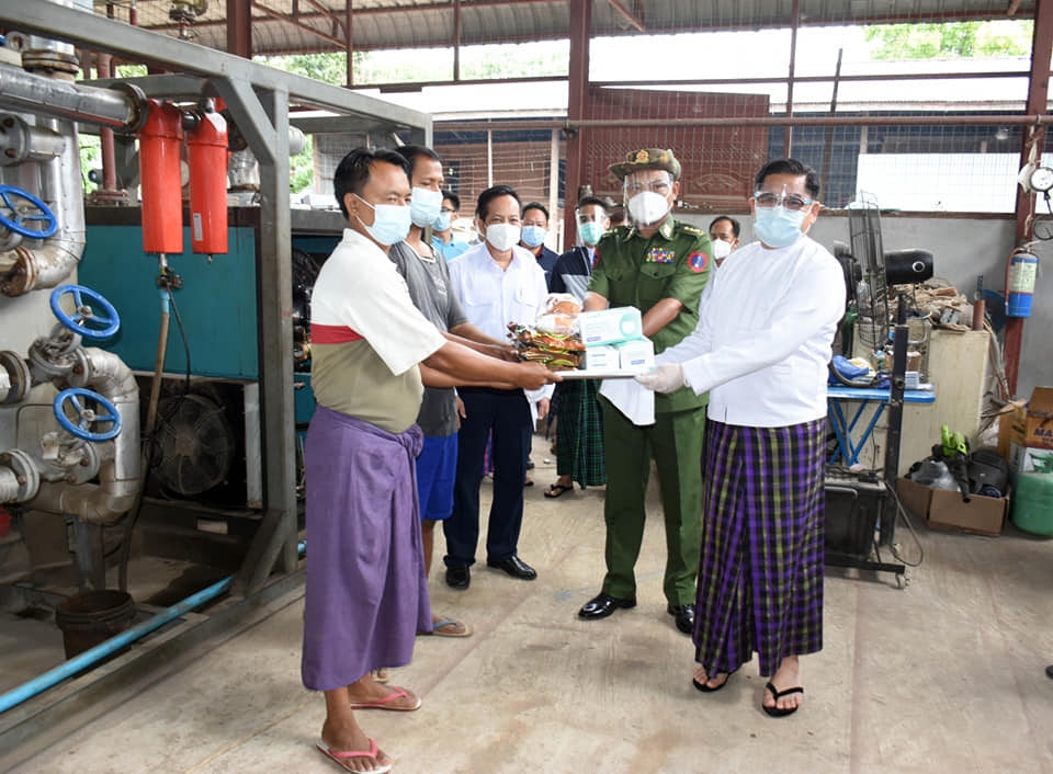 ယင်းနောက် ပြည်နယ်စီမံအုပ်ချုပ်ရေး ကောင်စီဥက္ကဋ္ဌက စက်ရုံအဆက်မပြတ် လည်ပတ်နိုင်ရေးအတွက် လိုအပ်သည့် ကူညီပံ့ပိုးမှုများ ဆောင်ရွက်ပေးနိုင်ရေး၊ စက်ပစ္စည်းများ ချို့ယွင်းအားနည်းမှု မဖြစ်ပေါ်စေရေးနှင့် လိုအပ်ချက်များ ပေါ်ပေါက်လာပါက အချိန်နှင့်တစ်ပြေးညီ ချိတ်ဆက် ဆောင်ရွက်ပေးနိုင်ရေး ဌာနဆိုင်ရာ တာဝန်ရှိသူများနှင့် ညှိနှိုင်းပေါင်းစပ်ဆောင်ရွက်ပေးခဲ့ကာ စက်ရုံ အလုပ်သမားများအတွက် အာဟာရမုန့်များနှင့် နှာခေါင်းစည်း Mask များကို ထောက်ပံ့ပေးအပ်ခဲ့ ကြသည်။