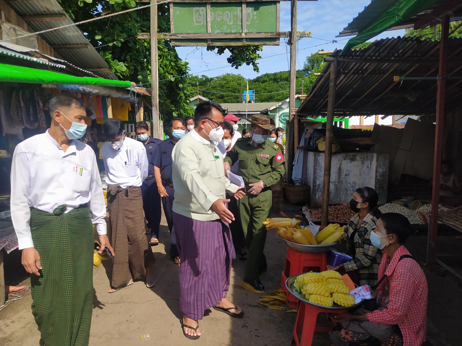 ထိုသို့ဆောင်ရွက်ရာတွင် မြို့နယ်ကိုဗစ်-၁၉ ရောဂါ ထိန်းချုပ်ရေးနှင့် အရေးပေါ် တုံ့ပြန်ရေးကော်မတီဥက္ကဋ္ဌ ဦးညီညီနှင့် အဖွဲ့ဝင်များ၊ မြို့နယ်စီမံအုပ်ချုပ်ရေး အဖွဲ့ဝင်များ၊ မြို့နယ်စည်ပင်သာယာရေး ကော်မတီ ဥက္ကဋ္ဌနှင့် ဝန်ထမ်းများ၊ ဌာနဆိုင်ရာများ၊ ရပ်ကွက်စီမံအုပ်ချုပ်ရေးမှူးများက စျေးရောင်း၊ စျေးဝယ် ပြည်သူများ ကိုဗစ်-၁၉ ရောဂါ ကူးစက်ပြန့်ပွားမှုမရှိစေရေးအတွက် စျေးအတွင်းသို့ ဝင်ရောက်ပါက နှာခေါင်းစည်း(Mask)ကို တပ်ဆင်စေခြင်း၊ လက်ကိုမကြာခဏ ဆေးကြောသင့်ကြောင်း၊ တစ်ဦးနှင့်တစ်ဦး ၆ ပေအကွာ ရောင်းချကြရန်၊ စျေးအတွင်း ကိုဗစ်-၁၉ ရောဂါ ပျံ့နှံ့မှုမှ ကာကွယ်နိုင်ရေး အတွက် စျေးရောင်း၊ စျေးဝယ်ပြည်သူများ ပူးပေါင်းပါဝင်ပေးကြပါရန် အသိပေးပြောကြားခဲ့သည်။