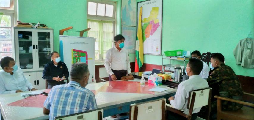 အစည်းအဝေးတွင် မြို့နယ်ကိုဗစ်-၁၉ရောဂါ ထိန်းချုပ်ကာကွယ်ရေးနှင့် အရေးပေါ်တုံ့ပြန်ရေး ကော်မတီဥက္ကဋ္ဌ ၊ မြို့နယ်အုပ်ချုပ်ရေးမှူး ဦးအောင်ထိုက်က ကိုဗစ်-၁၉ရောဂါ တတိယလှိုင်းဖြစ်ပွားမှု ၊ကူးစက်ပြန့် ပွားမှုအခြေအနေနှင့် ပတ်သက်၍ မြို့နယ်အတွင်း ရောဂါထိန်းချုပ်ကာကွယ် ကုသရေးလုပ်ငန်းများ အရှိန်အဟုန် မြှင့်တင်ဆောင်ရွက်ရန်၊ သတ်မှတ်ထားသော Quarantine Center များကို Community Based Facility Quarantine Center အဖြစ် အဆင့်မြှင့်တင်ဆောင်ရွက်ထားရှိကာ ရောဂါပိုး ပြန့်ပွားမှုမရှိစေရေး ထိန်းသိမ်းကြပ်မတ် နိုင်စေရန် ၊ အရေးပေါ်တုံ့ပြန်ရေး လုပ်ငန်းများအတွက် ကြိုတင်စီမံမှုများ ဆောင်ရွက်နိုင်ရန် တို့ကို ချပြဆွေးနွေးခဲ့သည်။