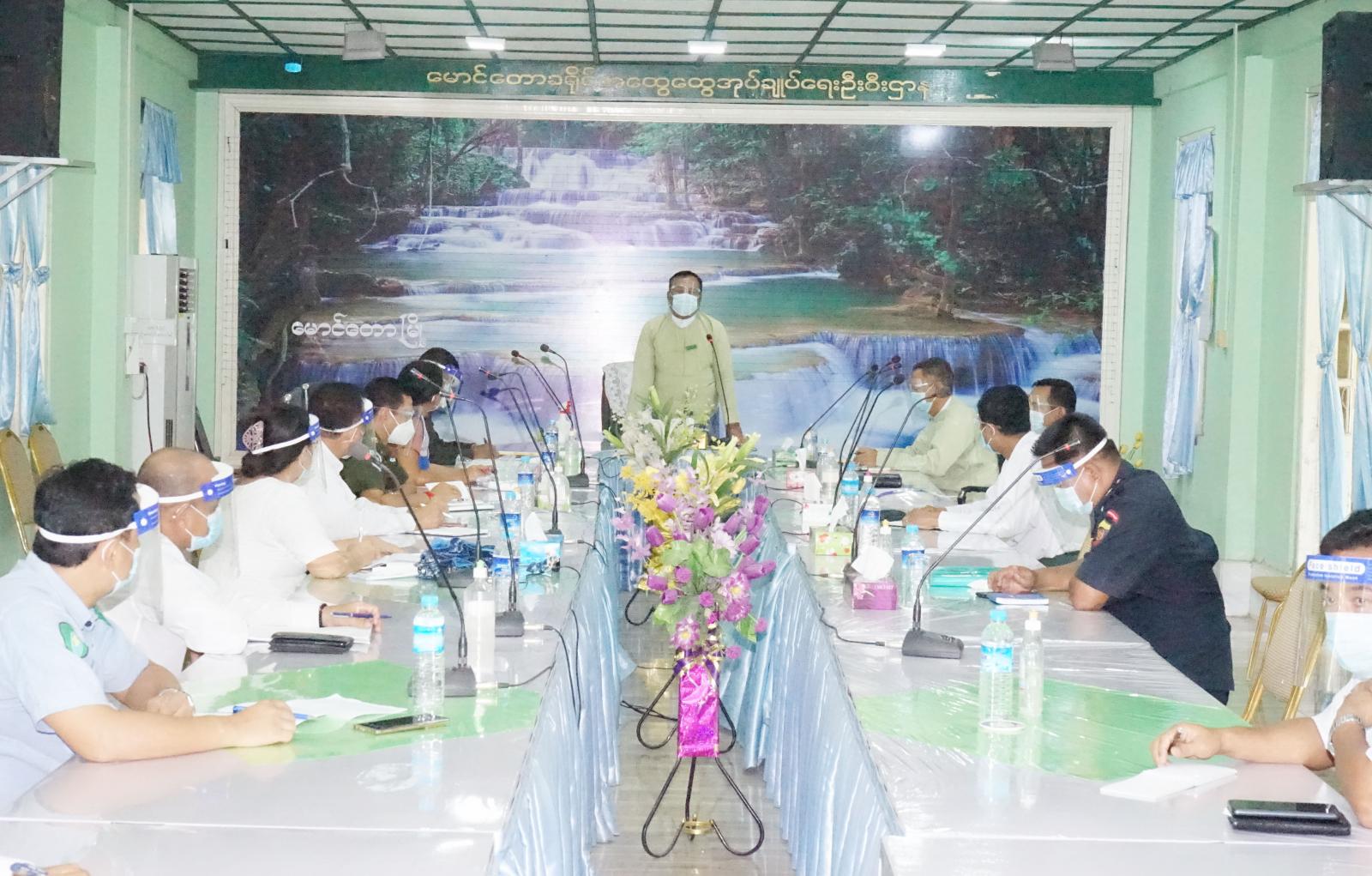 ရှေးဦးစွာ ခရိုင်စီမံအုပ်ချုပ်ရေးအဖွဲ့ဥက္ကဋ္ဌ ဦးနေဦးမှ အဖွင့်အမှာစကားပြောကြားရာတွင် ယခုအခါ မောင်တော မြို့၌ ကိုဗစ်-၁၉ ရောဂါကူးစက် ပြန့်နှံ့မှု များပြားနေသည့်အတွက် ကိုဗစ်-၁၉ ရောဂါ ကာကွယ် ထိန်းချုပ်ရေး လုပ်ငန်း များအား အရှိန်အဟုန်မြှင့် ဆက်လက်ဆောင်ရွက်ရေး၊ မြို့နယ်အတွင်း အောက်စီဂျင် ပြတ်လတ်မှုမရှိစေရေး နှင့် Home quarantine ထားရှိသည့် နေအိမ်များအား ဌာနဆိုင်ရာများနှင့် ရပ်ကွက်ကျေးရွာအုပ်ချုပ်ရေးမှူးများက နေအိမ်ပြင်ပ မထွက်စေရေး စနစ်တကျ ထိန်းချုပ်ပူးပေါင်း ဆောင် ရွက်ရန် ပြောကြားပြီး မြို့နယ်ကုသရေးဦးစီးဌာနမှူး ဒေါက်တာ နုကေသီစံမှ လက်ရှိ ပြည်သူ့ဆေးရုံ၌ ပိုးတွေ့လူနာအချို့ အောက်စီဂျင် ပေးနေရမှု အခြေအနေ၊ ပြည်သူ့ဆေးရုံ၌ အောက်စီဂျင် လိုအပ်ချက်များ၊ ပိုးတွေ့လူနာများ၏ အခြေအနေများ၊ ပိုးတွေ့လူနာများနှင့် ထိတွေ့ခဲ့သူများအား Home quarantineထားရှိမှု အခြေအနေများအား ရှင်းလင်း ပြော ကြားခဲ့သည်။ ထို့နောက် မြို့နယ်စီမံအုပ်ချုပ်ရေးအဖွဲ့ ဥက္ကဋ္ဌ ဦးကံထွန်းအောင်မှ လက်ရှိ ကိုဗစ်-၁၉ ပိုးတွေ့ လူနာ များ ထားရှိသည့် ကိစ္စရပ်များ ၊ ယာယီကုသရေးနေရာများတွင် ဆောင်ရွက်လျက်ရှိသည့် အခြေအနေများ၊ ကိုဗစ်-၁၉ ရောဂါ ကြိုတင် ကာကွယ် ထိန်း ချုပ်ရေး အတွက် နှာခေါင်းစည်း Maskများ ဖြန့်ဝေပေးနေမှု၊ မြို့ဝင်စစ်ဆေးရေးဂိတ်တွင် စစ်ဆေးဆောင်ရွက်မှုများ ရှင်းလင်းပြောကြားသည်။