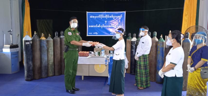 ရခိုင်ပြည်နယ်၊ အမ်းမြို့နယ်တွင် အနောက်ပိုင်းတိုင်းစစ်ဌာနချုပ်မှ အောက်ဆီဂျင် (၄၀)လီ တာဆန့်(၄၇)လုံး၊ နွားနို့၊ ကြက်ဥ၊ ဘီစကွတ်မုန့်တို့ကို ယနေ့ နံနက်(၁၀)နာရီအချိန်က မြို့နယ်ပြည်သူ့ဆေးရုံသို့ ပေးအပ်လှူဒါန်းခဲ့ကြောင်း သိရှိရသည်။
