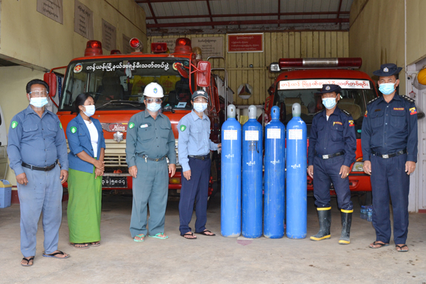 မြို့နယ်တွင် ကိုဗစ် - ၁၉ ရောဂါ ကူးစက်ပြန့်ပွားမှုမရှိစေရန်အတွက် မြို့နယ် အရန်မီးသတ်တပ်ရင်းမှ ဆောင်ရွက်နေသော အောက်စီဂျင်လိုအပ်သူများအား အခမဲ့ငှားရမ်းခြင်း လုပ်ငန်းကို အထောက်အကူဖြစ်စေ ရန် မြို့နယ်စည်ပင်သာယာရေးဌာန အမှုဆောင်အရာရှိ မိုင်းဟင်္သာထွန်းနှင့် တာဝန်ရှိသူတို့က အောက်စီဂျင် 40-Liter (၄)လုံးကို မြို့နယ်အရန်မီးသတ် တပ်ရင်းရုံးတွင် ပေးအပ်လှူဒါန်းသည်။