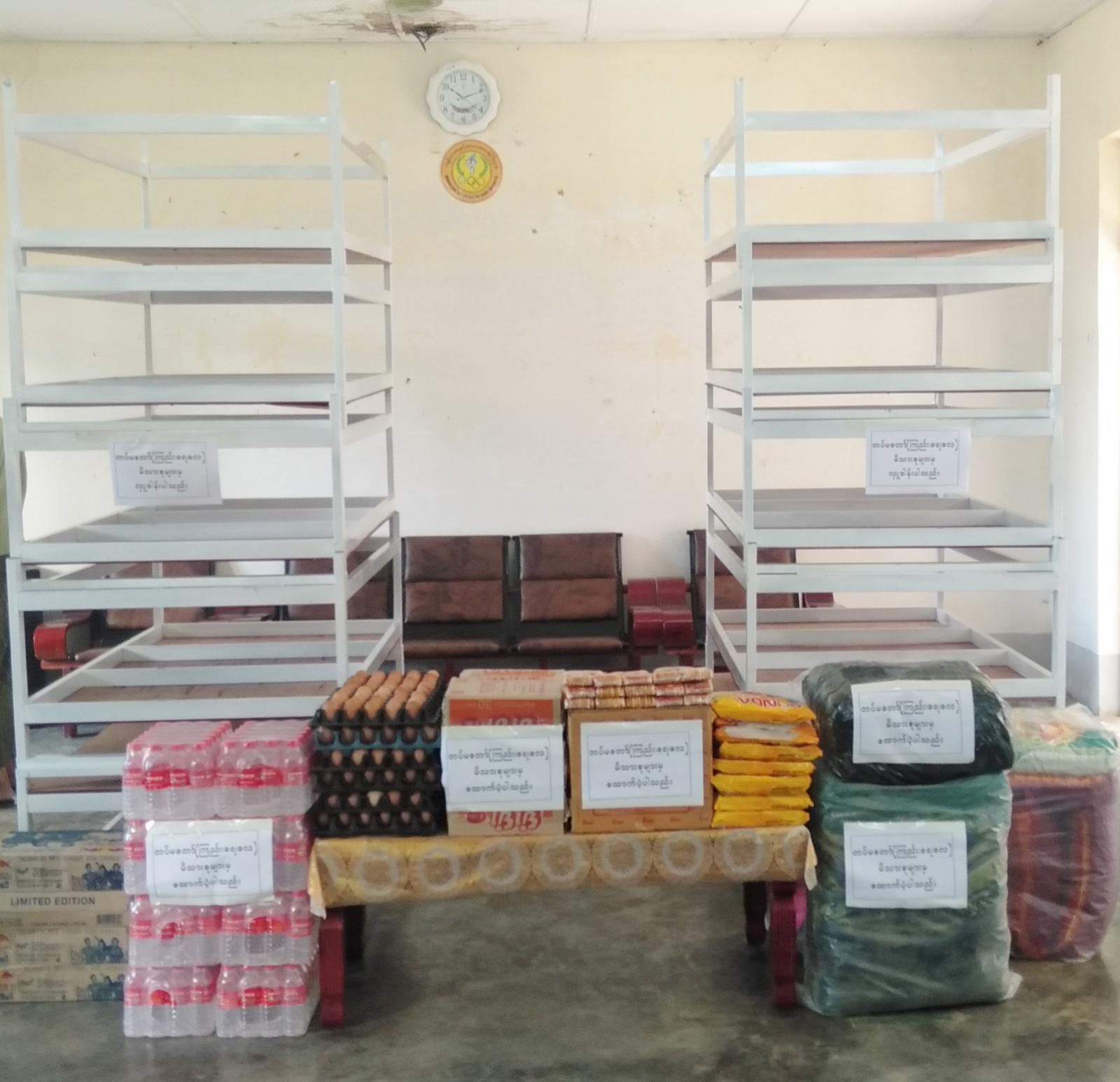 ထောက်ပံ့ပေးအပ်သည့် ပစ္စည်းများမှ ကုတင်(၁၀)လုံး၊ ရေသန့်(၁၂)ကတ်၊ကြက်ဉ(၁၂)ကတ်၊ ခေါက်ဆွဲခြောက်(၅)ဖာ၊ Tea Mix (၁၄)ထုတ်၊ခြင်ထောင်(၁၀)လုံး၊စောင်ထူ(၁၀)ထည်၊ စောင်ကျား(၁၀)ထည်၊ ခေါင်းအုံး(၁၀)လုံး၊ ဘီစကစ်(၁)ဖာနှင့်အချိုရည်(၄)ဖာတို့ပါဝင်ကြောင်း တာဝန်ရှိသူများထံမှ သိရသည်။