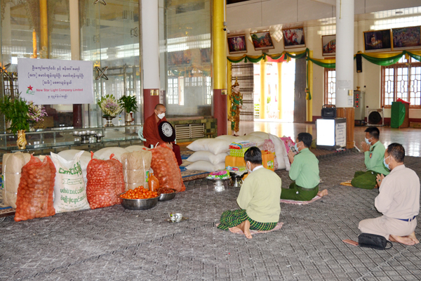 ဆက်ကပ် လှူဒါန်းခြင်းတွင် ဦးကျော်ကျော်ဝင်းနှင့် ဇနီး ဒေါ်မေရင် (မိသားစု) နယူးစတားလိုက် ဆောက်လုပ်ရေးကုမ္ပဏီမှ လှူဒါန်းထားသည့် ဆန် (၂၀၀)အိတ်၊ ဆီ (၆၀)ပုံး၊ ဆား (၆၀)ပိဿာ၊ ကြက်သွန်နီ (၅၀၀)ပိဿာ၊ ကြက်သွန်ဖြူ (၄၀)ပိဿာ၊ ငြုတ်သီးခြောက် (၂၀)ပိဿာ၊ အာလူး (၅၀၀)ပိဿာ၊ ကုလားပဲ (၁၀)အိတ်၊ ကြာဆံ (၁၀၀)ပိဿာ၊ ခရမ်းချဉ်သီး (၁၂၀)ပိဿာ၊ အရောင်တင်မှုန့် (၁၀)ပိသာနှင့် ဆပ်ပြာမှုန့်၊ ဆပ်ပြာခဲ၊ သွားတိုက်ဆေး၊ သွားတိုက်တံ စသည့် လှူဒါန်းဖွယ်ရာပစ္စည်းများကို ကျောင်းတိုက် စုစုပေါင်း (၁၅)ကျောင်းအား ခွဲဝေဆက်ကပ် လှူဒါန်းခဲ့ခြင်းဖြစ်ကြောင်း သိရသည်။