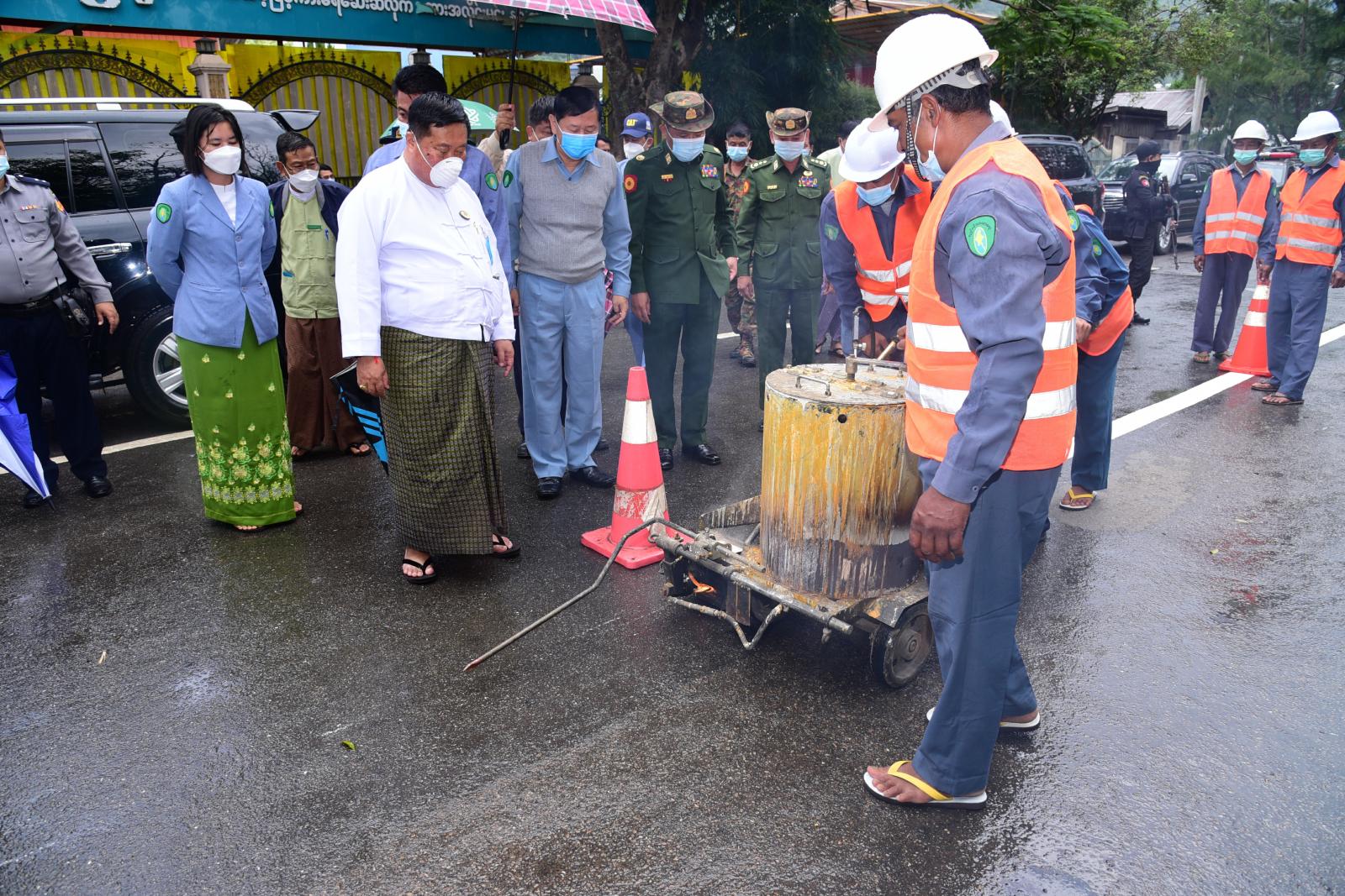 ဆက်လက်၍ ရှမ်းပြည်နယ်အစိုးရအဖွဲ့ ပြည်နယ်ဝန်ကြီးချုပ် ဒေါက်တာကျော်ထွန်း၊ အရှေ့ပိုင်းတိုင်း စစ်ဌာနချုပ် တိုင်းမှူး ဗိုလ်ချုပ်နီလင်းအောင်၊ ပြည်နယ်ဝန်ကြီးများ၊ ပြည်နယ်ဥပဒေချုပ်နှင့် ပြည်နယ်အဆင့် ဌာနဆိုင်ရာ တာဝန်ရှိတို့သည် တောင်ကြီးမြို့ အထက (၁) ကျောင်းအနီး အရှေ့မြို့ပတ်လမ်းတွင် တောင်ကြီးမြို့နယ် စည်ပင်သာယာရေးဌာနမှ ကတ္တရာလမ်းပေါ်၌ ယာဥ်သွားမျဥ်းလမ်းကြောင်း ဆောင်ရွက်နေမှု၊ မြကန်သာရေကန် အနီးလမ်းနှင့် မလွတ်သည့် သစ်ပင်များ ရှင်းလင်းနေမှု၊ တောင်ကြီးမြို့ အနောက်မြို့ပတ်လမ်း ညောင်ဖြူစခန်း ရပ်ကွက်ရှိ ကံ့ကော်တံတား ရေနုတ်မြောင်းများတွင် အမှိုက်များဆည်ယူနေမှုတို့ကို လှည့်လည်ကြည့်ရှုပြီး လိုအပ် သည်များကို ပြည်နယ်ဝန်ကြီးချုပ် ဒေါက်တာကျော်ထွန်းက ဖြည့်စွက်မှာကြားခဲ့ကြောင်း သိရှိရသည်။