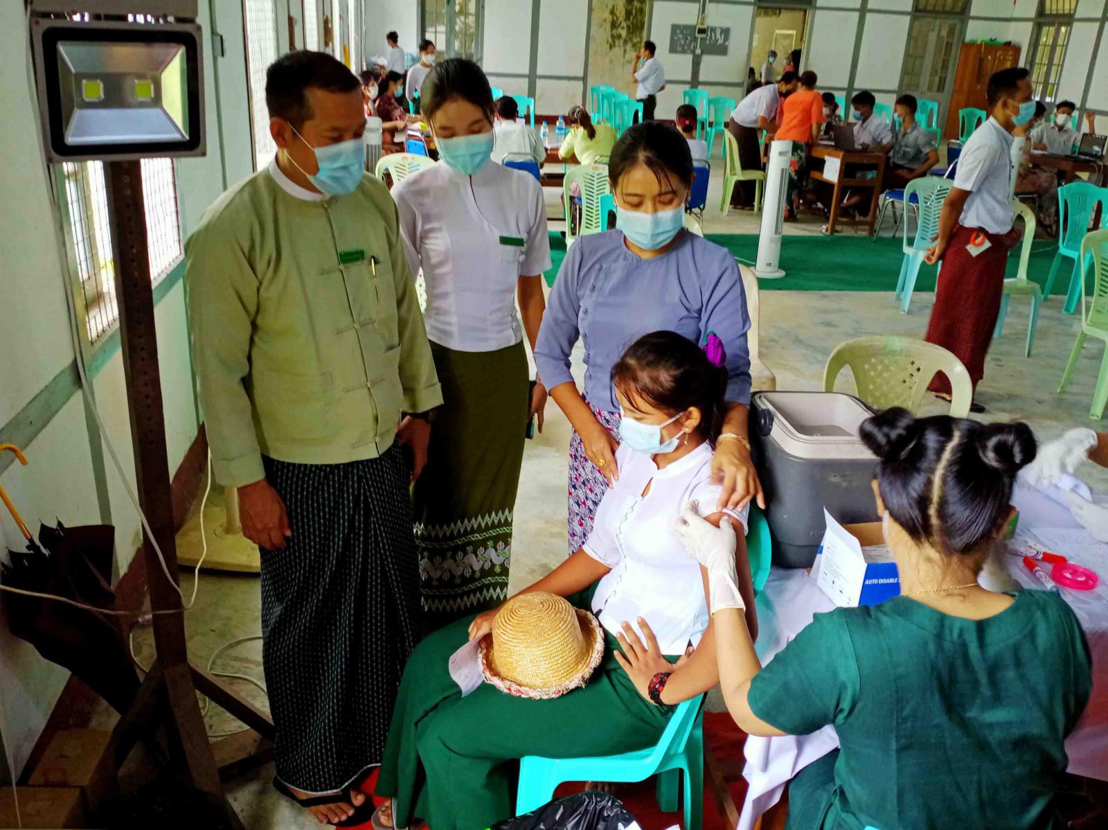 ထိုသို့ ကိုဗစ်-၁၉ ရောဂါကာကွယ်ဆေးထိုးနှံခြင်းများဆောင်ရွက်ရာတွင် ဆေးထိုးရန်လာရောက် ကြသည့် အသက်(၁၂)နှစ်နှင့်အထက်ရှိ ကျောင်းသား၊ ကျောင်းသူများကို ပညာရေးဌာနမှ ဝန်ထမ်းများ က လက်သန့်ဆေးရည်များဖြင့် လက်ဆေးစေခြင်း၊ ကိုယ်အပူချိန်တိုင်းတာပေးခြင်း၊ သွေးပေါင်ချိန်တိုင်း တာ ပေးခြင်းနှင့် စာရင်းမှတ်တမ်းရေးသွင်းကောက်ယူခြင်းများကို ဆောင်ရွက်ပေးပြီး ကျန်းမာရေး ဌာနမှဝန် ထမ်းများက ကာကွယ်ဆေးထိုးနှံပေးခြင်းများကို စနစ်တကျဆောင်ရွက်ပေး လျက်ရှိသည်။