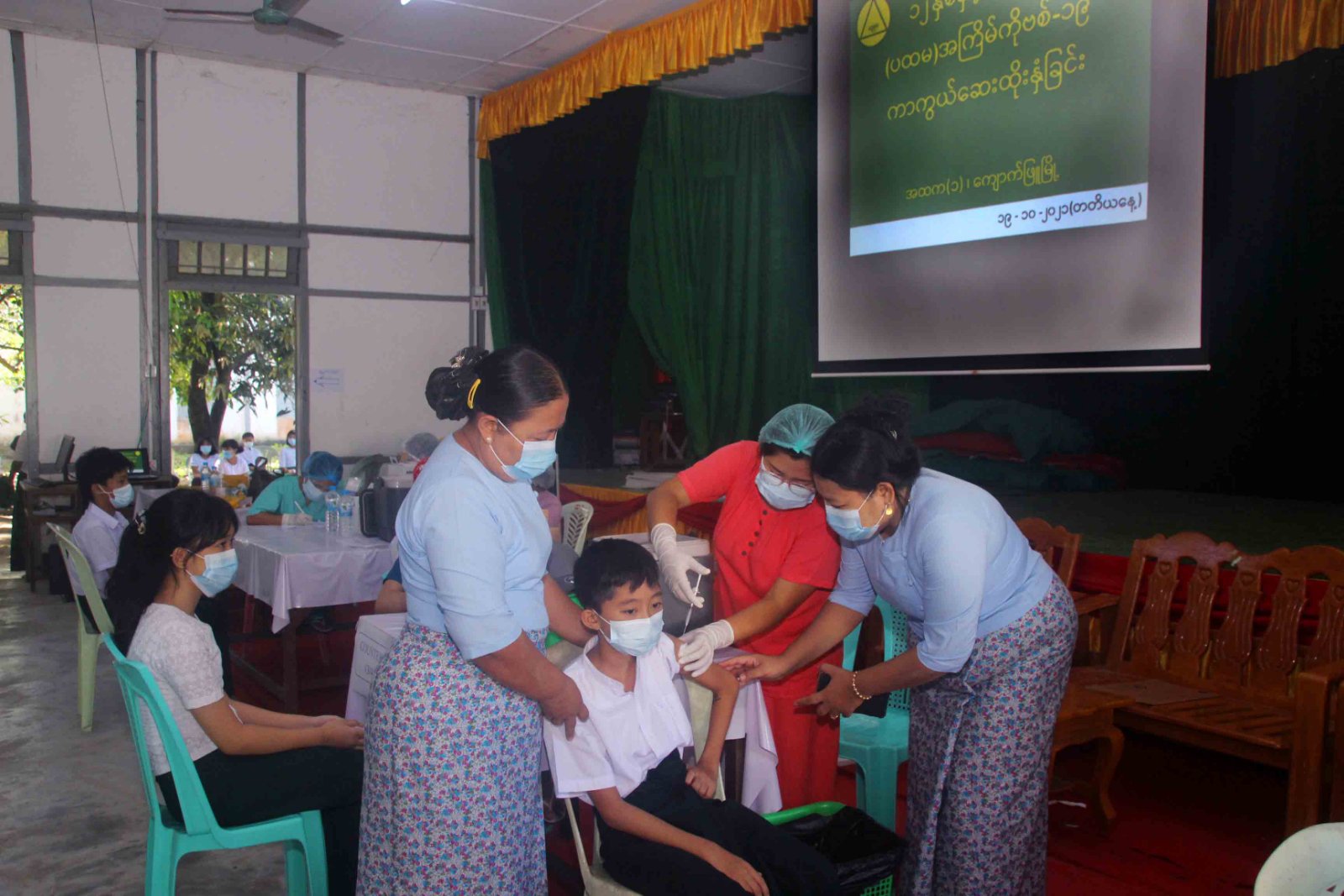 ထိုသို့ ကိုဗစ်-၁၉ ရောဂါ ကာကွယ်ဆေးထိုးနှံခြင်းများ ဆောင်ရွက်ရာတွင် ဆေးထိုးရန် လာရောက် ကြသည့် အသက်(၁၂)နှစ်နှင့်အထက်ရှိ ကျောင်းသား၊ ကျောင်းသူများကို ပညာရေးဌာနမှ ဝန်ထမ်းများက လက်သန့်ဆေးရည်များဖြင့် လက်ဆေးစေခြင်း၊ ကိုယ်အပူချိန်တိုင်းတာပေးခြင်း၊ သွေးပေါင်ချိန်တိုင်းတာပေးခြင်းနှင့် စာရင်းမှတ်တမ်းရေးသွင်း ကောက်ယူခြင်းများကို ဆောင်ရွက်ပေးပြီး ကျန်းမာရေးဌာနမှ ဝန်ထမ်းများက ကာကွယ်ဆေးထိုးနှံပေးခြင်းများကို စနစ်တကျ ဆောင်ရွက်ပေးလျက် ရှိသည်။