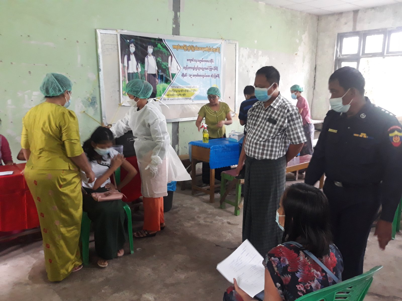 ထိုသို့ ကိုဗစ်-၁၉ ရောဂါ ကာကွယ်ဆေးထိုးနှံရာတွင် ကာကွယ်ဆေး လာရောက်ထိုးနှံကြသော ကျောင်းသား၊ ကျောင်းသူများကို ကျန်းမာရေးဝန်ထမ်းများနှင့် ကြက်ခြေနီတပ်ဖွဲ့ဝင်များက ကိုယ်အပူချိန် တိုင်းတာခြင်း၊ သွေးအတွင်း အောက်ဆီဂျင် လည်ပတ်မှုနှုန်း တိုင်းတာခြင်းတို့ကို ဆောင်ရွက်ပြီးမှသာ ကျန်းမာရေး လမ်းညွှန်ချက်များနှင့်အညီ မြို့နယ်ကျန်းမာရေးဝန်ထမ်းများက စနစ်တကျ ကာကွယ်ဆေးများ ထိုးနှံပေးလျက်ရှိကြောင်း သိရသည်။