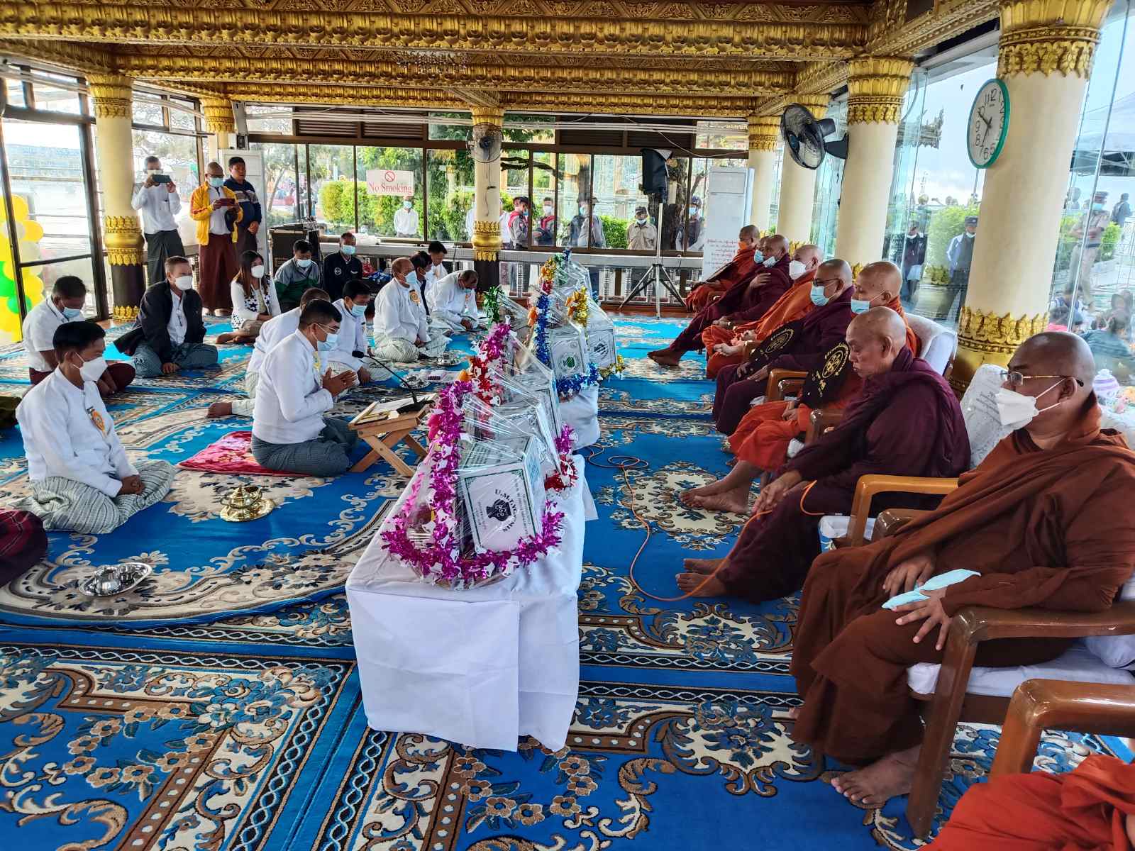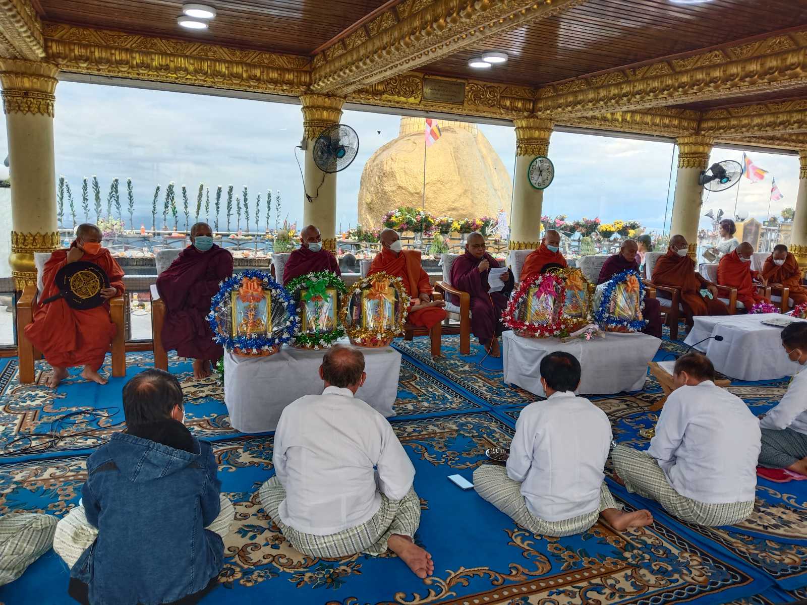 ရှေးဦးစွာ ကျိုက်ထီးရိုး ရင်ပြင်တော်ရှိတိဿဆောင်ဓမ္မာရုံ၌ ကျိုက်ထီးရိုးစေတီ ဩဝါဒါစရိယဆရာတော် ဥူးပဏ္ဍိစ (ကော့ထင်း အောင်သပြေကမ္မဌာန်းကျောင်းတိုက် ဆရာတော်)အမှူးပြုသော ဩဝါဒစရိယဆရာတော်(၁၁)ပါးအားမွန်ပြည်နယ် သာသနာရေးမှူး ဦးအောင်ဝင်းထွန်း ကျိုက်ထီးရိုးစေတီ ဘဏ္ဍာတော်ထိန်း ဂေါပကအဖွဲ့ ခေါင်းဆောင် ဦးစိုးလှနှင့်အဖွဲ့ဝင်များမှ အာရုဏ်ဆွမ်း ဆက်ကပ်လှူဒါန်းခဲ့သည်။