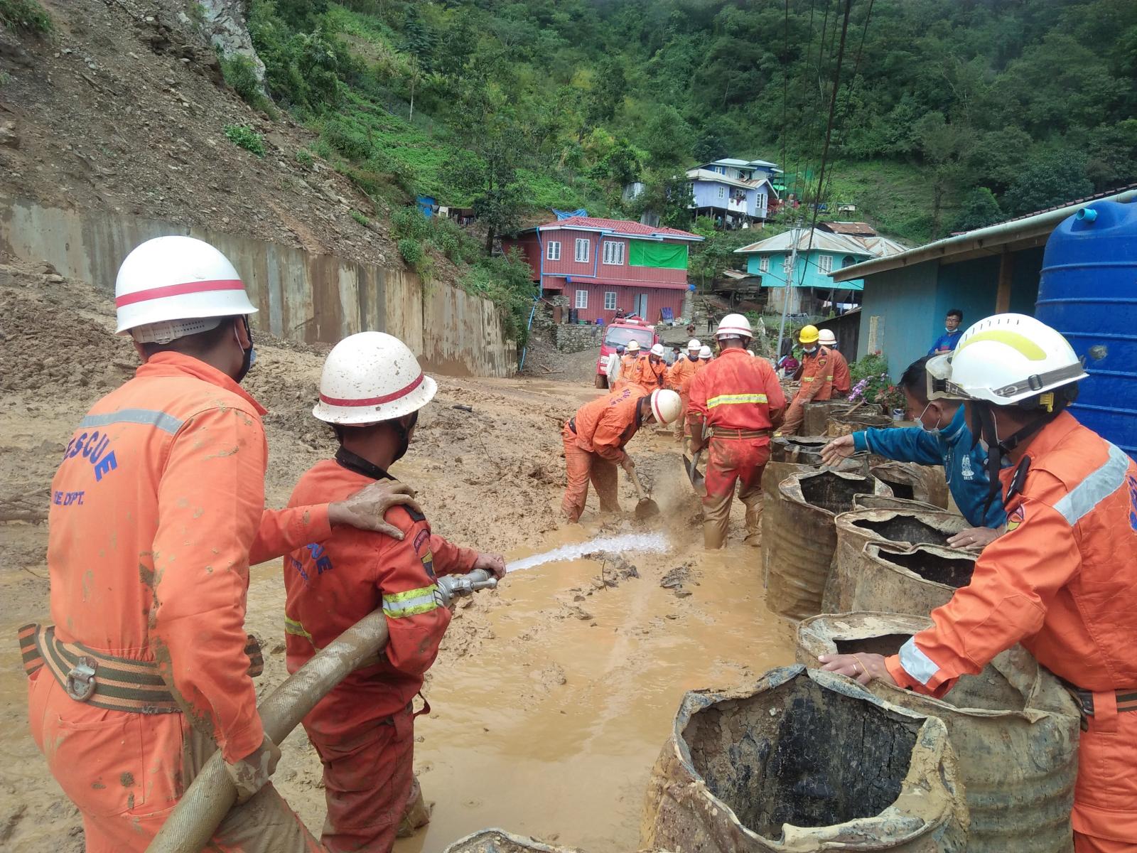 လမ်းမြို့၌အောက်တိုဘာလ ၁၆ ရက်၊ ညနေပိုင်းမှစ၍ မိုးသည်းထန်စွာရွာသွန်း မှုကြောင့်တလန်လို ရပ်ကွက် ဗိုလ်ချုပ်လမ်းမ၏ အပေါ်ဘက်အမြင့်ပေ ၁၀၀၊အလျား ၈၀ ခန့်ကမ်းပါးယံမြေပြို ကျမှုဖြစ်ပွားပြီး လမ်းပိတ်ဆို့မှု ဖြစ်ပွားသဖြင့် ခရိုင်မီးသတ်ဦးစီးမှူးဦးစာရုံမန်း ဦးဆောင်သော ခရိုင်မြို့နယ်မီးသတ်တပ်ဖွဲ့ဝင် (၃၀)ဦးတို့က အုပ်ချုပ်မှု ယာဉ်(၁)စီး၊ သူနာတင်ယာဉ်(၁)စီးနှင့်မီးသတ်ယာဉ်(၁)စီး တို့ဖြင့် မြေပြိုမှုဖြစ်ပွား သည့်နေရာသို့ သွားရောက်ပြီးရပ်ကွက်နေပြည်သူ (၂၀)ဦးတို့နှင့်အတူ မီးသတ်ယာဉ်အား အသုံးပြု၍ပြိုကျနေ သောမြေစာ များရှင်းလင်းခြင်း၊ ကျောက်တုံးများအား ဖယ်ရှားရှင်းလင်းခြင်းကို နံနက် ၁၁ မှ ညနေ ၄ နာရီအထိဆောင်ရွက် ခဲ့ရာမော်တော်ဆိုင်ကယ် များနှင့်မော်တော်ယာဉ်ငယ်များသွားနိုင်ပြီဖြစ် ကြောင်းသိရသည်။
