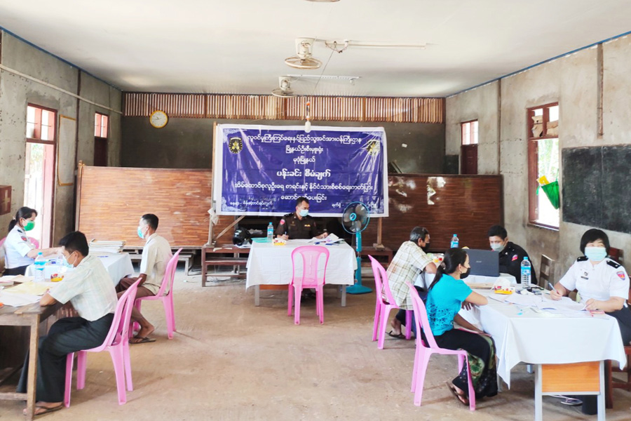 ပန်းခင်းစီမံချက်ဖြင့် ဒေသခံပြည်သူများကို လူဝင်မှုကြီးကြပ်ရေးနှင့် ပြည်သူ့အင်အား ဝန်ကြီးဌာန မြို့နယ်ဦးစီးမှူးရုံးမှ ဝန်ထမ်းများက နိုင်ငံသားစိစစ်ရေးကတ်ပြား ပြုလုပ်ဆောင်ရွက်ပေးရာ ကမာဝက်မြို့ စိန်တောင်ရပ်ကွက်ရှိ ဒေသခံပြည်သူ (၃၀၀) ကျော်ကို ကိုဗစ်-၁၉ စည်းကမ်းချက်များနှင့် အညီ (၂) ရက်ကြာ နိုင်ငံသား စိစစ်ရေးကတ်ပြား ပြုလုပ်ဆောင်ရွက်ပေးသည်။