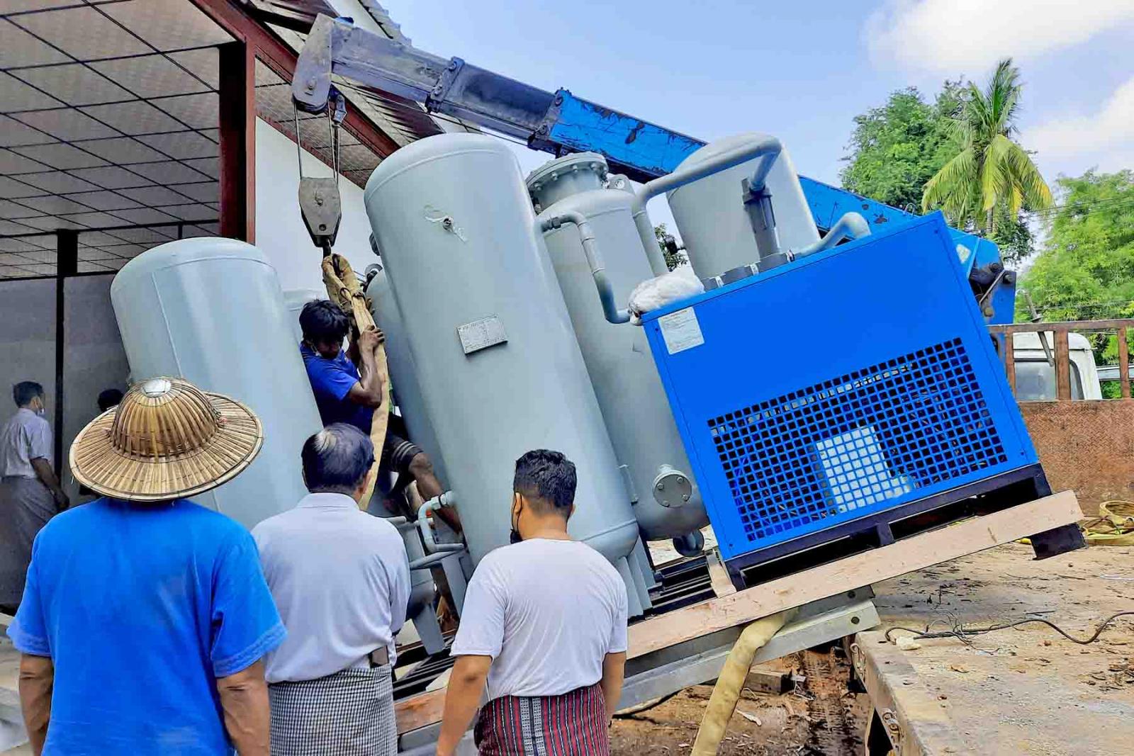 တိုင်းဒေသကြီးအစိုးရအဖွဲ့မှ ထောက်ပံ့ပေးသည့် အောက်ဆီဂျင်စက်အား ယနေ့နံနက်ပိုင်းတွင် မြို့နယ်ကိုဗစ် - ၁၉ ရောဂါ ကာကွယ်ထိန်းချုပ်ရေးနှင့် အရေးပေါ်တုံ့ပြန်ရေး ကော်မတီဥက္ကဋ္ဌ မြို့နယ် အုပ်ချုပ်ရေးမှူး ဦးအောင်မြတ်ခိုင်၏ အနီးကပ် ကြီးကြပ်မှုဖြင့် မြို့နယ်အောက်ဆီဂျင်ဖြစ်မြောက်ရေး အဖွဲ့ဥက္ကဋ္ဌ ဦးတင်ဝမ်းနှင့် အဖွဲ့ဝင်များ၊ မြို့နယ်မီးသတ်တပ်ဖွဲ့ဝင်များ၊ စေတနာ့ဝန်ထမ်း (Volunteer) အဖွဲ့ဝင်များနှင့် ဒေသခံပြည်သူများက အောက်ဆီဂျင်စက်ရုံ လည်ပတ်ထုတ်လုပ်နိုင်ရေးအတွက် အောက်ဆီဂျင်စက်ရုံ အဆောက်အဦအတွင်း ဝိုင်းဝန်းကူညီ ရွှေ့ပြောင်းပေးခဲ့ကြကြောင်း သိရသည်။