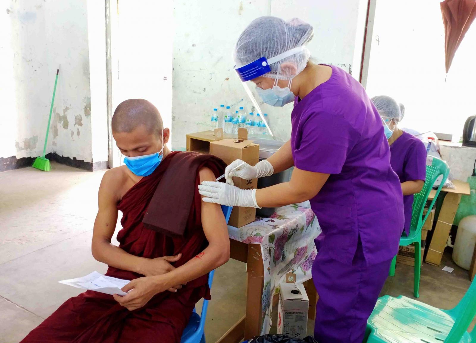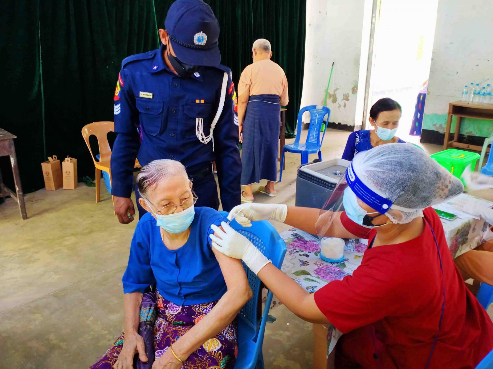 ကိုဗစ်-၁၉ ရောဂါကာကွယ်ဆေးများထိုးနှံရာတွင် မီးသတ်တပ်ဖွဲ့ဝင်များနှင့် စေတနာ့ဝန်ထမ်း များက ကာကွယ်ဆေးထိုးနှံရန်လာရောက်ကြသည့် ပြည်သူများကို သတ်မှတ်နေရာများသို့ လိုက်ပါပို့ ဆောင်ပေးခြင်း၊ အထွေထွေအုပ်ချုပ်ရေးဦးစီးဌာနမှ ဝန်ထမ်းများက စာရင်းမှတ်တမ်းရေးသွင်း ကောက်ယူခြင်း၊ ကျန်းမာရေးဌာနမှဝန်ထမ်းများက ကိုယ်အပူချိန်တိုင်းတာပေးခြင်း၊ သွေးပေါင်ချိန် တိုင်းတာပေးခြင်းတို့ကို စနစ်တကျဆောင်ရွက်ပေးပြီး ပုံမှန်အခြေအနေရှိသူများသာ ကာကွယ်ဆေးများကိုထိုးနှံပေး လျက်ရှိသည်။