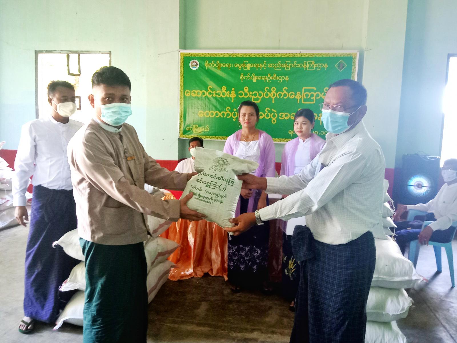 ပဲခူးတိုင်းဒေသကြီး၊ ပဲခူးခရိုင်၊ ဝေါမြို့နယ်၊ စိုက်ပျိုးရေးဦးစီးဌာနက ကျင်းပပြုလုပ်သည့် တောင်သူများ အား ဆောင်းသီးနှံ သီးညှပ်စိုက် နေကြာမျိုးစေ့ ထောက်ပံ့ပေးအပ်ပွဲကို ယမန်နေ့ နံနက် ၁၁ နာရီက မြို့နယ်စိုက်ပျိုးရေးဦးစီးဌာန၊ အစည်းအဝေး ခန်းမဆောင်၌ ကျင်းပသည်။
