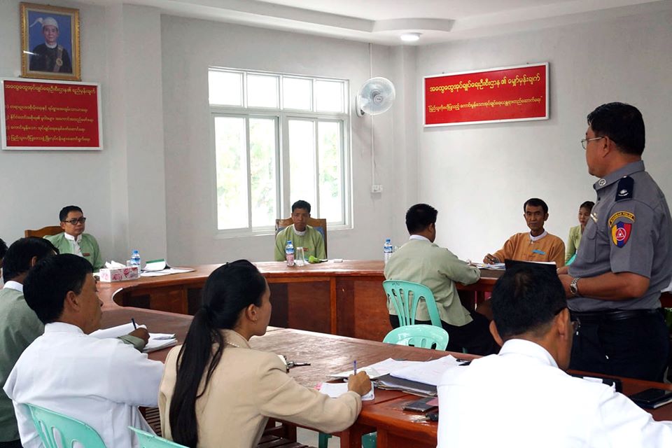 ဆက်လက်ပြီး ခရိုင်လူဝင်မှုကြီးကြပ်ရေးနှင့်ပြည်သူ့အင်အားဆိုင်ရာရုံးမှ ဦးစီးအရာရှိ ဦးဝင်းထွန်း က မဲစာရင်းတွင်ပါဝင်ပြီး နိုင်ငံသားကတ် မရှိသူများအား ကွင်းဆင်းဆောင်ရွက်ပေးမှု အခြေအနေများကို လည်းကောင်း၊ မြို့နယ် ရဲတပ်ဖွဲ့မှူး ရဲမှူးဌေးလှိုင်က မဲရုံများတွင် လုံခြုံရေး ချထားရန် ကြိုတင်ပြင်ဆင်ဆောင်ရွက်နေမှုများကို လည်းကောင်း၊ မြို့နယ်ကော်မရှင်အဖွဲ့ခွဲမှ ဦးစီးအရာရှိ ဒေါ်နန်းဝိုခမ်း က ပထမအကြိမ် မဲဆန္ဒရှင် စာရင်းကြေညာပြီးစီးမှုနှင့် လုပ်ငန်း လိုအပ်ချက်များကို တင်ပြဆွေးနွေးသည်။