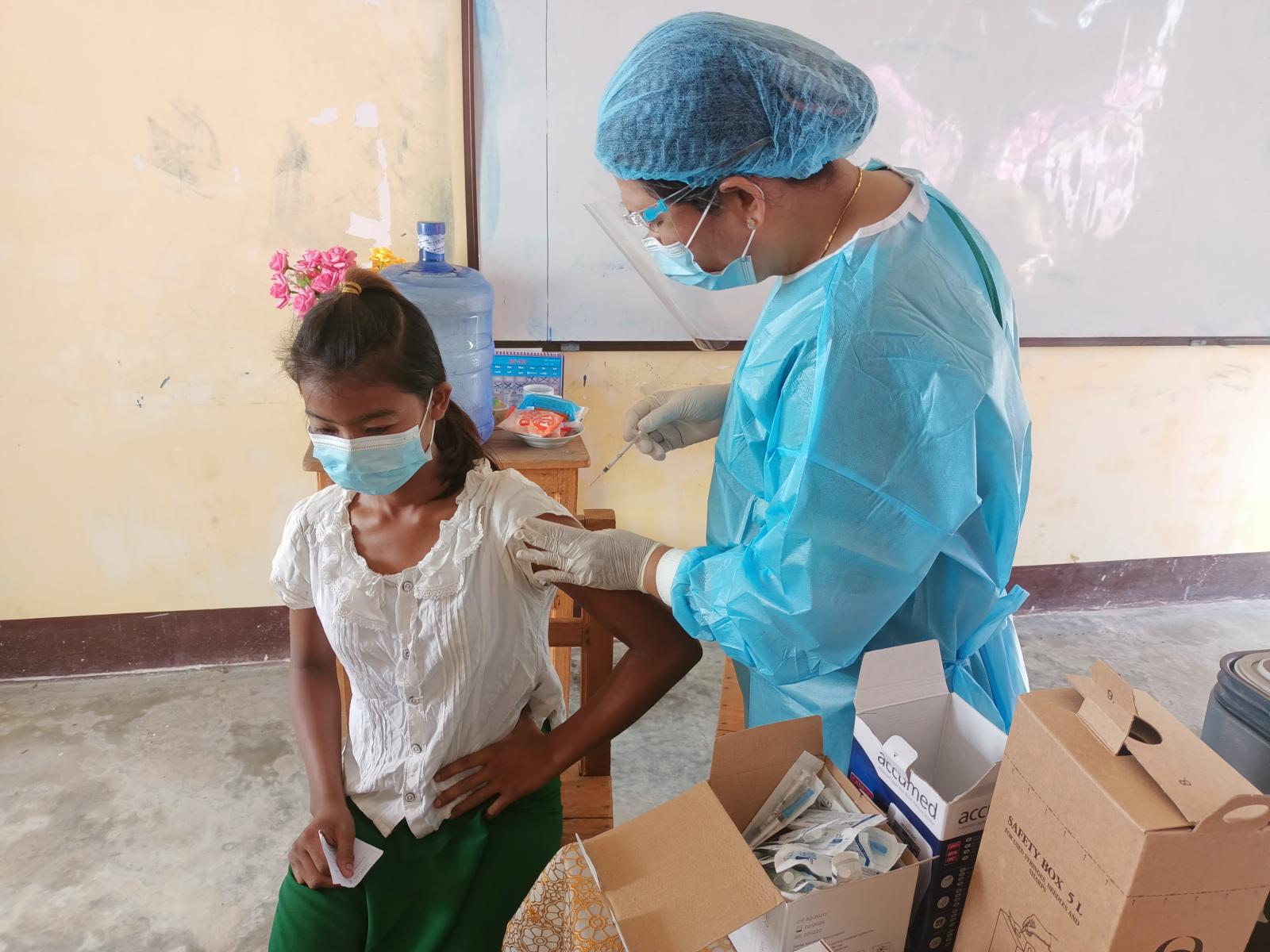 ကိုဗစ်-၁၉ရောဂါကာကွယ်ဆေးထိုးနှံမှုကိုမြို့နယ်အဆင့် ဌာနဆိုင်ရာများ၊ အထွေထွေအုပ်ချုပ်ရေးဦးစီးဌာန ဝန်ထမ်းများ၊ ကျန်းမာရေးဉီးစီးဌာနမှဝန်ထမ်းများ၊ ဆရာ/ဆရာမများက ကာကွယ်ဆေးထိုးနှံရန်လာ ရောက်ကြ သည့် ကျောင်းသား/ကျောင်းသူများအား သတ်မှတ်နေရာသို့ လိုက်ပါ ပို့ဆောင်ပေးခြင်း၊ လိုအပ်သည့်ကူညီမှုများ ဆောင်ရွက်ပေးခြင်း၊ စာရင်းမှတ်တမ်း ရေးသွင်းကောက်ယူခြင်း၊ ကိုယ်အပူချိန် တိုင်းတာပေးခြင်း၊ အောက်ဆီဂျင် တိုင်းတာပေးခြင်းနှင့် သွေးပေါင်ချိန်တိုင်းတာ ပေးခြင်းတို့ကို စနစ်တကျကူညီဆောင်ရွက်ပေးခဲ့ပြီး ကိုဗစ်-၁၉ စည်းကမ်းသတ်မှတ်ချက်များနှင့်အညီ ကာကွယ်ဆေးထိုးနှံပေးကာ မိနစ်(၃၀)ခန့် အနားယူစေပြီး ကျန်းမာရေး စောင့်ရှောက်မှုများဆောင်ရွက်ပေးလျက်ရှိကြောင်းသိရသည်။