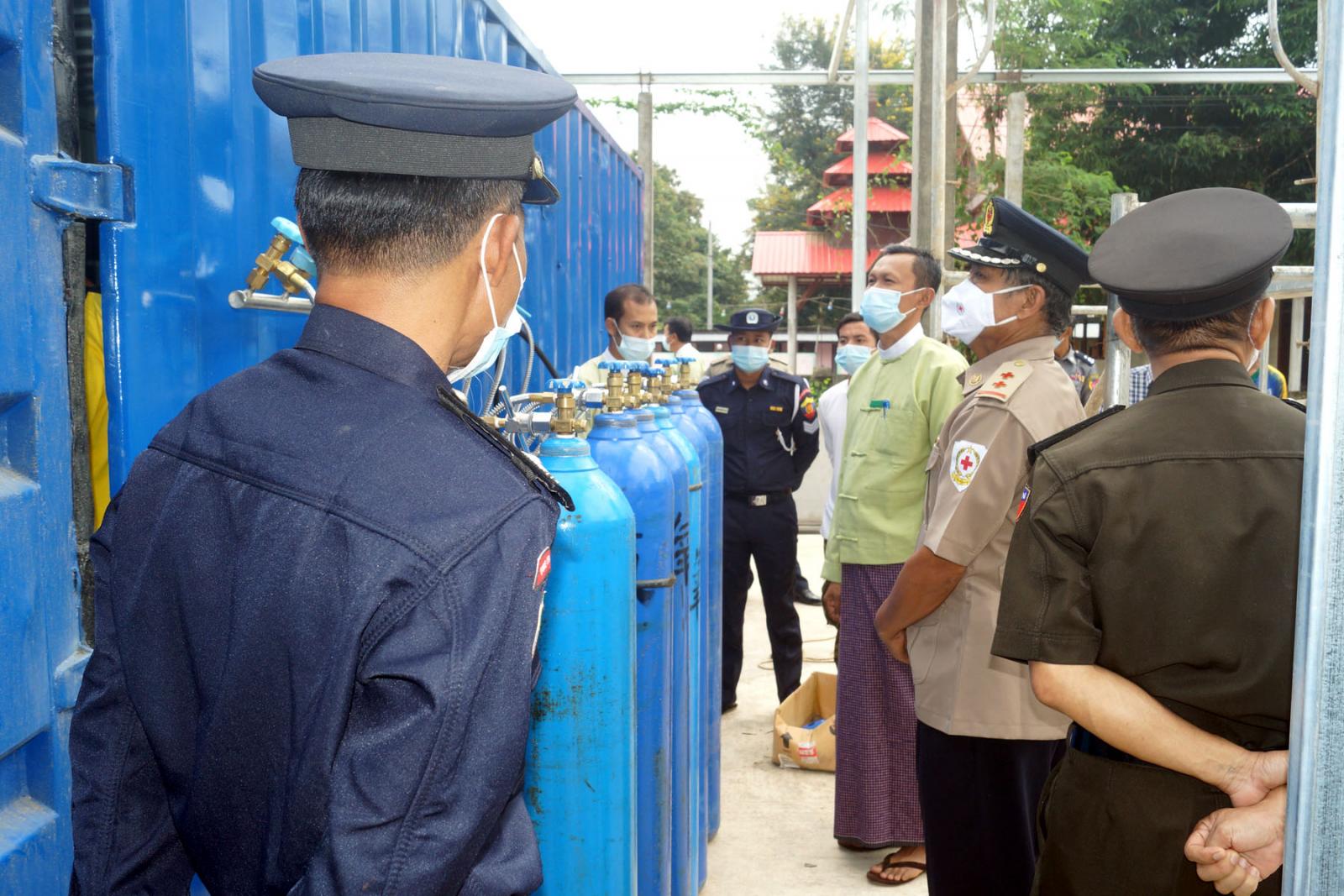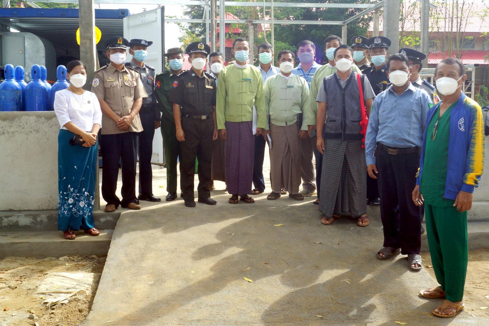 အောက်ဆီဂျင်ထုတ်စက်အား SMART IZUMI ELECTRONIC LTD မှ ဦးကျော်ရဲအောင်ကလွှဲပြောင်း ပေးအပ်ရာ ခရိုင်စီမံအုပ်ချုပ်ရေးအဖွဲ့ဥက္ကဋ္ဌ ဦးအောင်ဟိန်းကျော်နှင့်တာဝန်ရှိသူတို့က လက်ခံရယူခဲ့ပြီး အောက်ဆီဂျင်ထုတ် စက်လည်ပတ်နေမှုနှင့် အောက်ဆီဂျင်ဖြည့်သွင်းနေမှု အခြေအနေတို့ကို ကြည့်ရှု စစ်ဆေးခဲ့သည်။