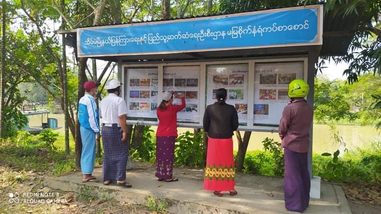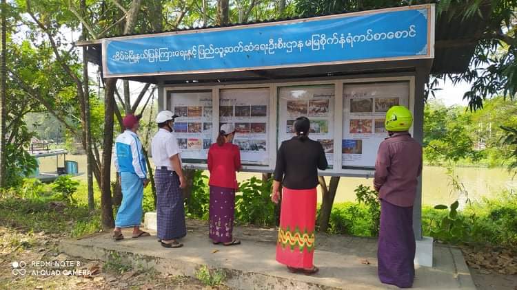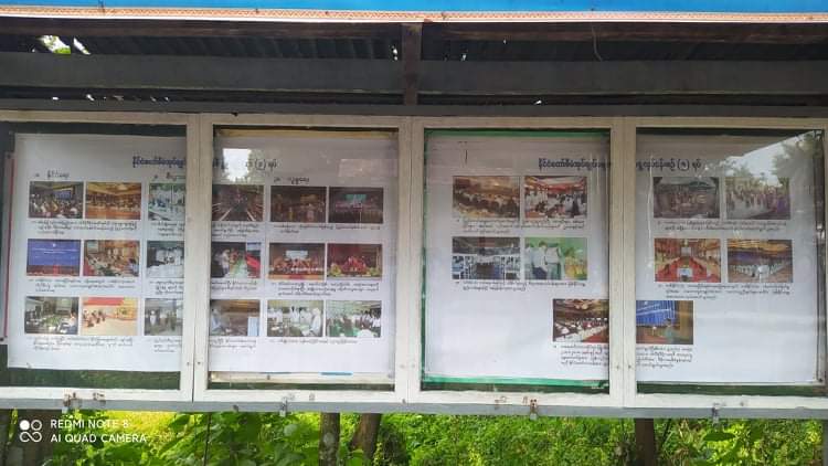 ဧရာဝတီတိုင်းဒေသကြီး၊ မြောင်းမြခရိုင်၊ အိမ်မဲမြို့နယ် ပြန်ကြားရေးနှင့် ပြည်သူ့ဆက်ဆံရေး ဦးစီးဌာန မြေစိုက်နံရံကပ်ပြဘုတ်တွင် အသိပညာပေး နံရံကပ်စာစောင်များကို လစဉ်အသစ် လဲလှယ် ပြသဆောင်ရွက်လျက်ရှိရာ ယနေ့နံနက်ပိုင်းတွင် နိုင်ငံတော်စီမံအုပ်ချုပ်ရေး ကောင်စီ ၏ ရှေ့လုပ်ငန်းစဉ်(၅)ရပ်နှင့် ဦးတည်ချက်(၉)ရပ်ပါဝင်သည့် ဆောင်ရွက်ချက် မှတ်တမ်း ဓာတ်ပုံများ ပြသဆောင်ရွက်ထားကြောင်း သိရသည်။
