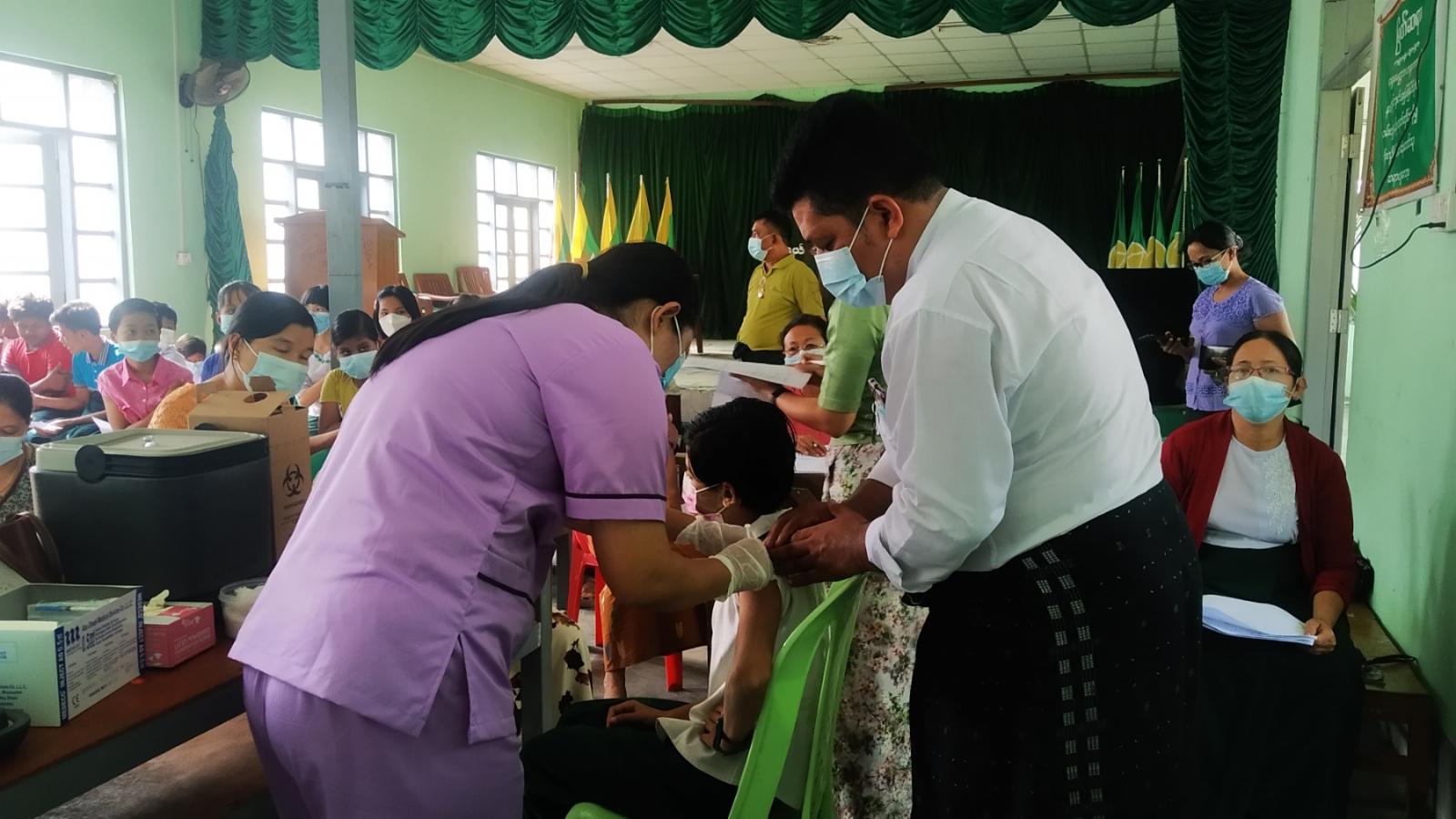 ထိုသို့ဆေးထိုးရာတွင် မြို့နယ်ပညာရေးဌာနမှ ဆရာ/ဆရာမများနှင့် ကြက်ခြေနီတပ်ဖွဲ့ဝင်များမှ ကာကွယ်ဆေးထိုးနှံရန် ရောက်ရှိလာသူများအား ကျန်းမာရေးဝန်ကြီးဌာန၏ ကိုဗစ် လမ်းညွှန်ချက်များနှင့် အညီ ကာကွယ်ဆေးမထိုးနှံမီ ကိုယ်အပူချိန်တိုင်းတာပေးခြင်း၊ သွေးပေါင်ချိန်တိုင်းတာပေးခြင်းများ ဆောင်ရွက်ပေးခြင်းနှင့် ပုံမှန်အနေအထား ရောက်ရှိမှသာ ကာကွယ်ဆေးထိုးနှံပေး လျက်ရှိပြီး ကာကွယ်ဆေး ထိုးနှံပြီးသူများအား မိနစ် ၃၀ ခန့် အနားယူ စေခြင်း များအား စီစဉ်ဆောင်ရွက်ပေးလျက်ရှိကြောင်း သိရသည်။