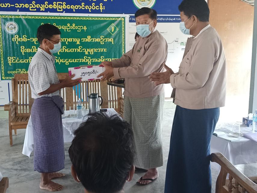 အဆိုပါ ထောက်ပံ့ငွေပေးအပ်ပွဲတွင် စိုက်ပျိုးရေးဦးစီးဌာန(နေပြည်တော်) ဒုတိညွှန်ကြားရေးမှူး ချုပ် ဦးအေးကိုကို က မိုးစပါးစိုက် ဧက ၁ ဧကလျှင် မျိုးစေ့ဖိုး ၈၅၀ဝိ/- ကျပ်၊ စိုက်ပျိုးစရိတ် ၇၅၀၀ဝိ/- ကျပ်နှင့် စုစုပေါင်း မိုးစပါး စိုက်ဧက ၂၃ဒသမ၅ ဧကအတွက် ငွေကျပ် ၁,၉၆၂,၂၅ဝိ/- ကိုတောင်သူတစ်ဦးချင်းအား ပေးအပ်သည်။