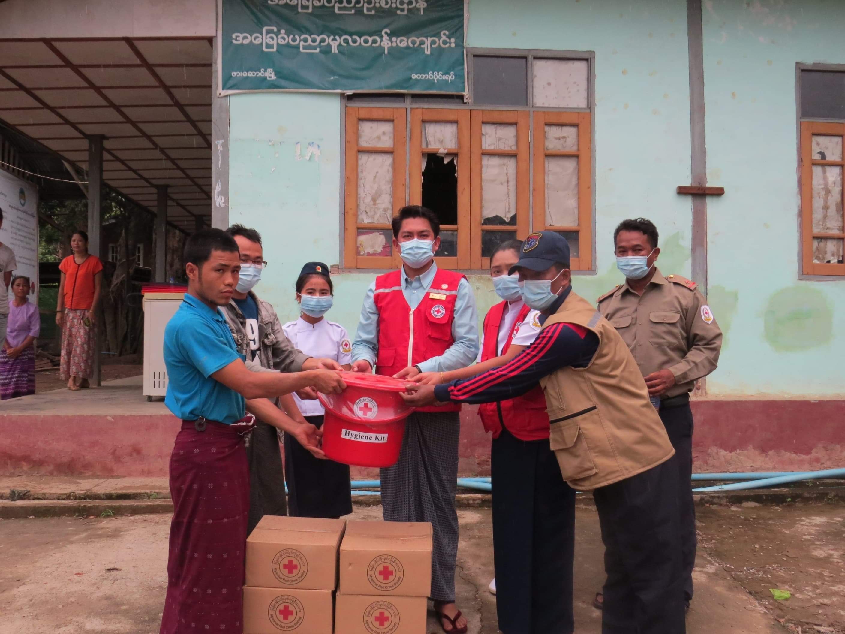 ဆက်လက်၍ ထောက်ပံ့ပစ္စည်းများကို ရေဘေးသင့်အိမ်ထောင်စုများ ယာယီနေထိုင်သည့် နေအိမ်များသို့ လည်း အိမ်တိုင်ရာရောက် ပြည်နယ်ကြက်ခြေနီအသင်းခွဲ ကြီးကြပ်မှုကော်မတီနှင့် တပ်ဖွဲ့ဝင်များက လက်ရောက်ပေးအပ်ခြင်းများကိုလည်း ဆောင်ရွက်ခဲ့ကြ သည်။ ယင်းထောက်ပံ့ပစ္စည်းများမှာ Hygiene Parcel contents list (တစ်ကိုယ်ရည်သုံးပစ္စည်း ၁၁ မျိုးပါ) စက္ကူဖာ (၁၀၁)ဖာ၊ Hygiene kit contents list (တစ်ကိုယ်ရည်သုံးပစ္စည်း ၁၈ မျိုးပါ) ပုံးအနီ(၁၂)ပုံး၊ Dignity Kit (အမျိုးသမီးအသုံးအဆောင်ပစ္စည်းပါ) အိတ်ပြာ (၄၅)အိတ်၊ Hand Gel (500mlပါ) ၁၂ ဘူး၊ ကာဘောလစ့်ဆပ်ပြာ(၅၀)တောင့်နှင့် ပြည်နယ် ကျေးလက်ဒေသ ဖွံ့ဖြိုးတိုးတက်ရေး ဦးစီးဌာနမှ Family kits (အိမ်အသုံးအဆောင် ပစ္စည်း ၁၆ မျိုးပါ) ၅၁ အိတ်တို့ကို ပေးအပ်လှူဒါန်းခဲ့ကြောင်း သိရသည်။