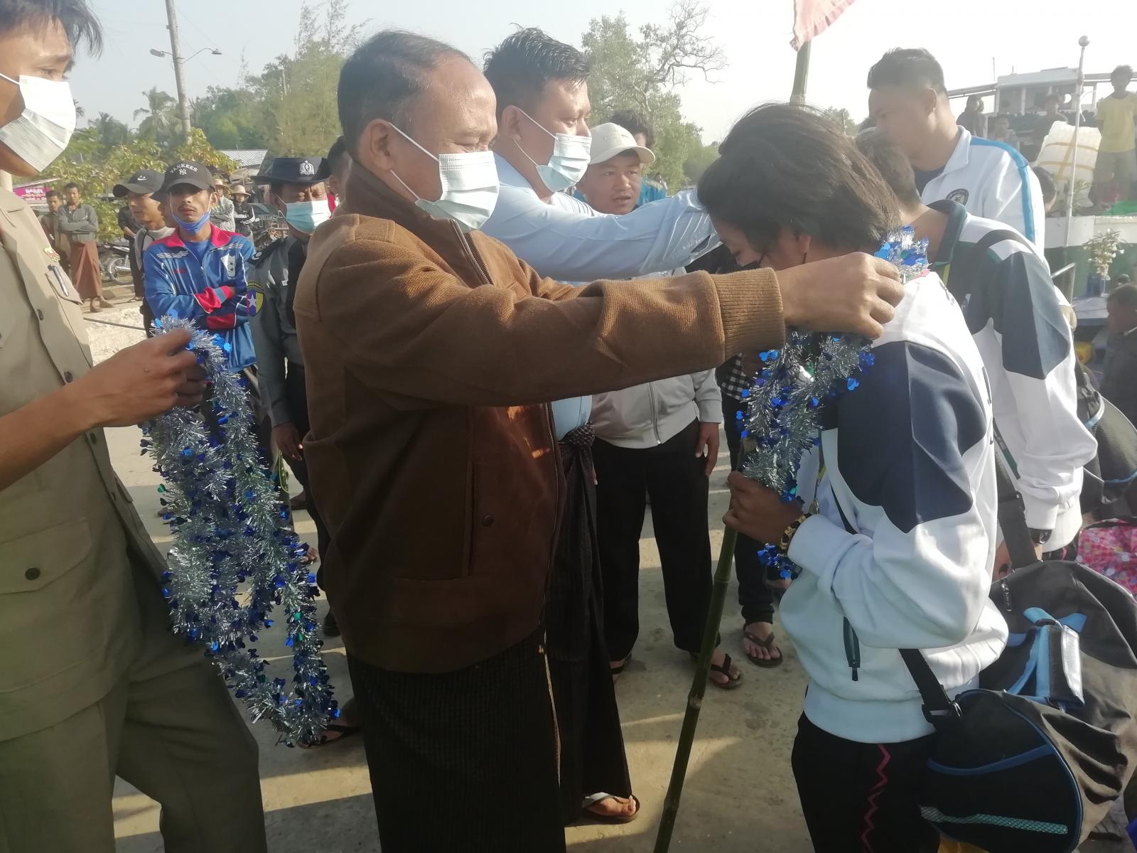 ရခိုင်ပြည်နယ် မာန်အောင်မြို့နယ်၌၂၀၂၂- ခုနှစ် တိုင်းဒေသကြီးနှင့်ပြည်နယ် အသက် ၂၅ နှစ်အောက် အမျိုးသမီးဘောလုံးပြိုင်ပွဲတွင် အောင်ပွဲရ ရခိုင်ပြည်နယ်အမျိုးသမီးဘောလုံးအသင်းမှ ဒုတိယဂိုးကို သွင်းယူပေးခဲ့သူ မာန်အောင်မြို့နယ် ကြက်ရိုးကျေးရွာမှ မသီရိစန္ဒာရွှေနှင့် ဘုန်းဆိုးကြီးကျေးရွာမှ ကစားသမားမခင်ထက်ထက်စံတို့သည် ယနေ့နံနက်ပိုင်းတွင် ရွှေလင်းယုန်အမြန်ရေယာဉ်ဖြင့် မာန်အောင်မြို့နယ်သို့ ပြန်လည်ရောက်ရှိလာရာ သင်္ဘောဆိပ်ကမ်း၌ မြို့နယ်စီမံအုပ်ချုပ်ရေးအဖွဲ့ဥက္ကဋ္ဌဦး ရွှေလှအောင်နှင့် အဖွဲ့ဝင်များ၊ ဌာနဆိုင်ရာများ၊ မြို့နယ်အားကစားသမားဟောင်းများအသင်းဝင်များ၊ အားကစားဝါသနာရှင် မိဘပြည်သူများက ပန်းစည်းများ၊ အောင်သပြေပန်းများဖြင့် သောင်းသောင်းဖြဖြဂုဏ်ပြုကြိုဆိုကြသည်။