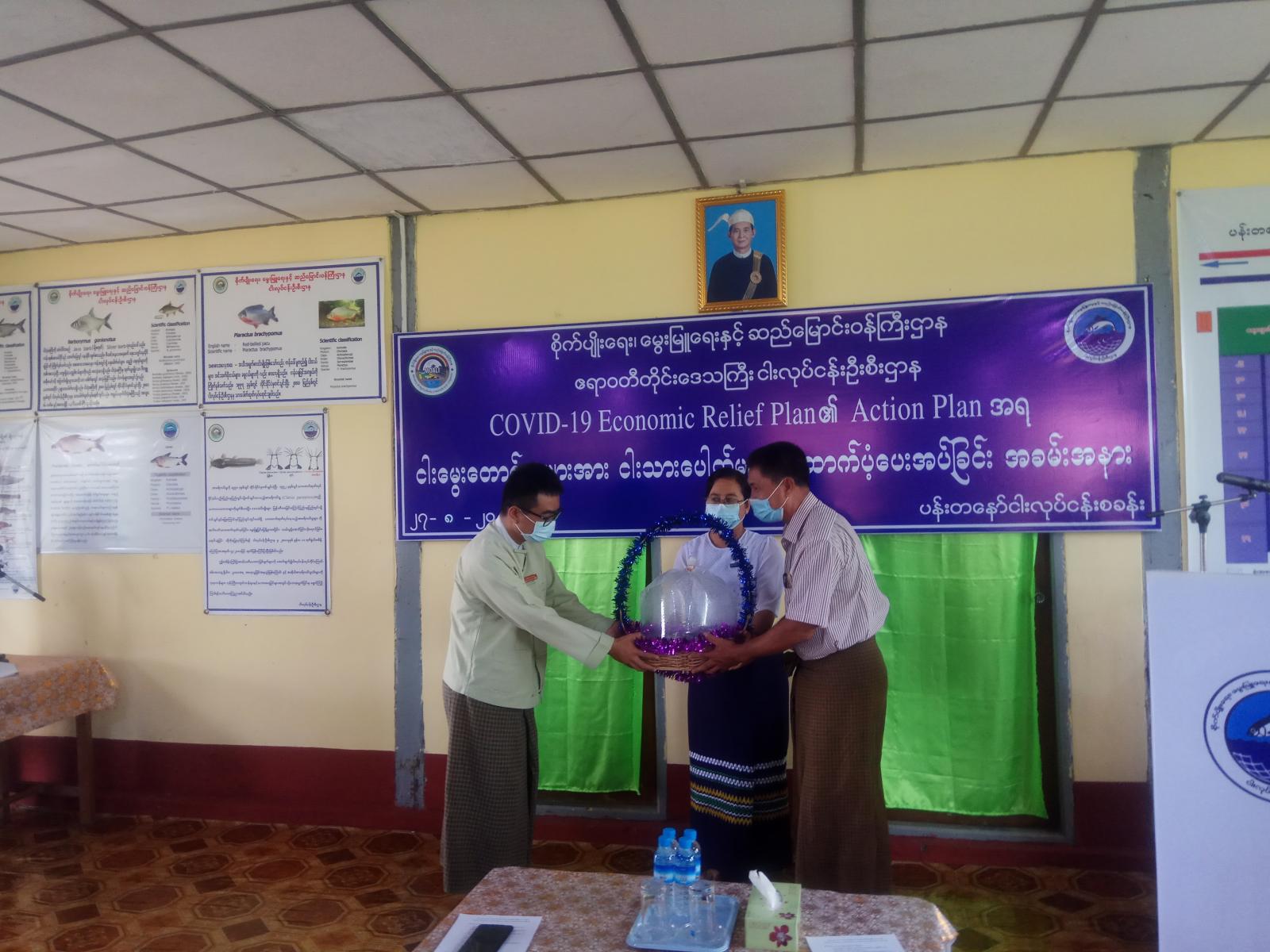 ဧရာဝတီတိုင်းဒေသကြီး၊ မအူပင်ခရိုင်၊ ပန်းတနော်မြို့နယ် ငါးလုပ်ငန်းဦးစီးဌာန ပသွယ်ငါးလုပ်ငန်းစခန်းမှ Covid-19 Economic Relief Plan ၏ Action Plan အရ ငါးမွေးတောင်သူများအား ငါးသားပေါက်များ ထောက်ပံ့ခြင်း အခမ်းနားကို ယနေ့နံနက် ၁၀ နာရီက ပသွယ်ကျေးရွာ ငါးလုပ်ငန်းစခန်း ခန်းမ၌ ကျင်းပသည်။