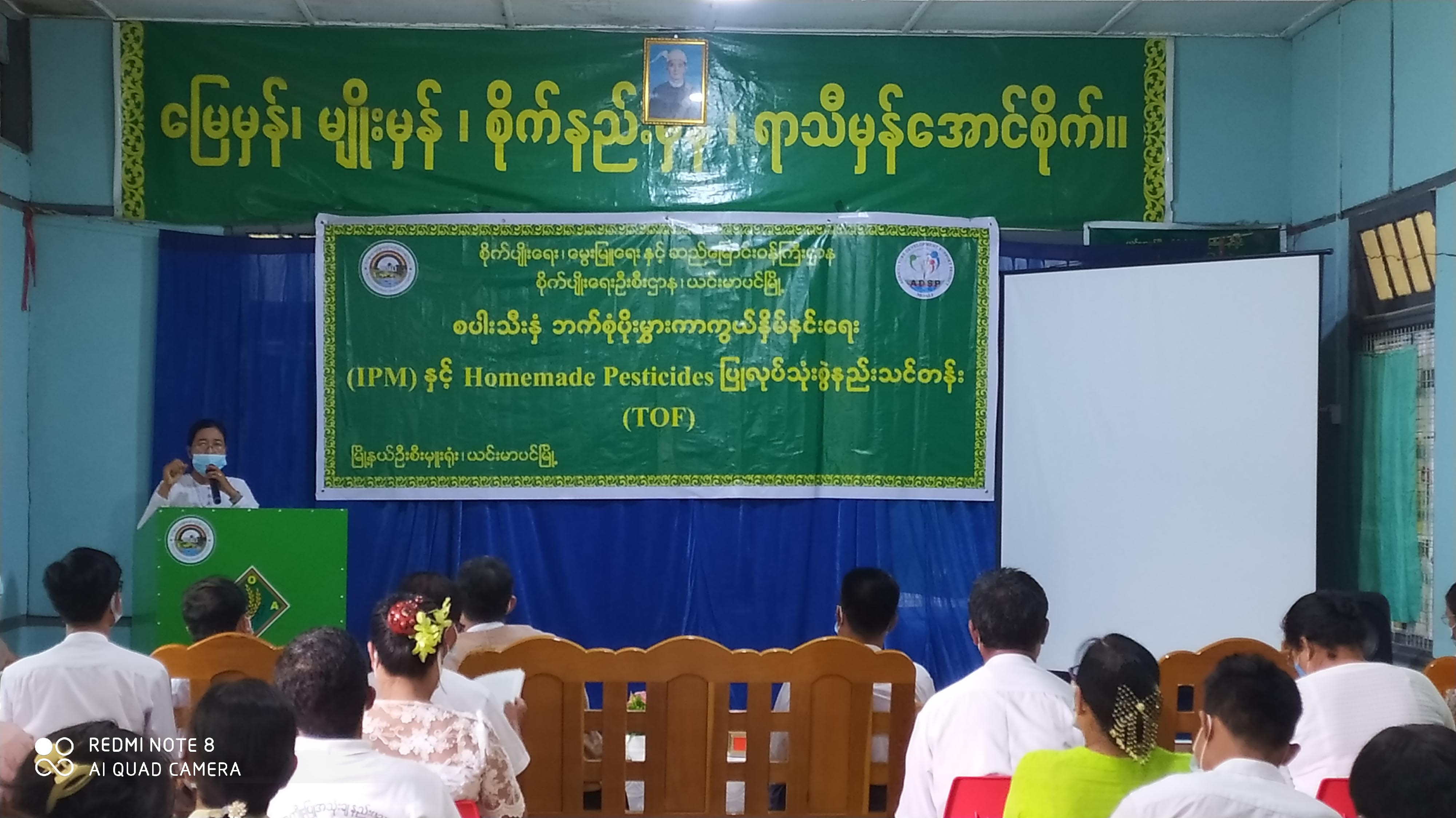 သင်တန်းဖွင့်ပွဲတွင် ယင်းမာပင်ခရိုင် စိုက်ပျိုးရေးဦးစီးဌာနမှ ခရိုင်ဦးစီးမှူး ဒေါ်မြတ်မိုးဝင်းက အဖွင့် အမှာစကား ပြောကြားပြီး ယင်းမာပင်မြို့နယ် စိုက်ပျိုးရေးဦးစီးဌာနမှ မြို့နယ်ဦးစီးမှူး ဒေါ်ခင်မာချိုက သင်တန်းဖွင့်လှစ်ရခြင်းမှာ တောင်သူများ မိမိတို့စိုက်ခင်း၌ ပိုးမွှားရောဂါကာကွယ်နှိမ်နင်းရာတွင် ဓာတုဆေး တစ်မျိုးတည်း သုံးစွဲခြင်းထက် ဘက်စုံပိုးမွှားရောဂါကာကွယ်နှိမ်နင်းနည်းများကို သိရှိ၍လိုက်နာ ကျင့်သုံး လာတတ်စေရန်၊ Homemade Pesticides ပြုလုပ်သုံးစွဲနည်းများ ကိုယ်တိုင်သိရှိ ပြုလုပ်သုံးစွဲတတ် လာစေရန်၊ ဓာတုဆေးများ သုံးစွဲမှုလျော့နည်းလာစေရန်နှင့် အစားအစာ ဘေးကင်းလုံခြုံမှုရှိစေရန် စသည့် ရည်ရွယ်ချက်များကို ရှင်းလင်းပြောကြားသည်။