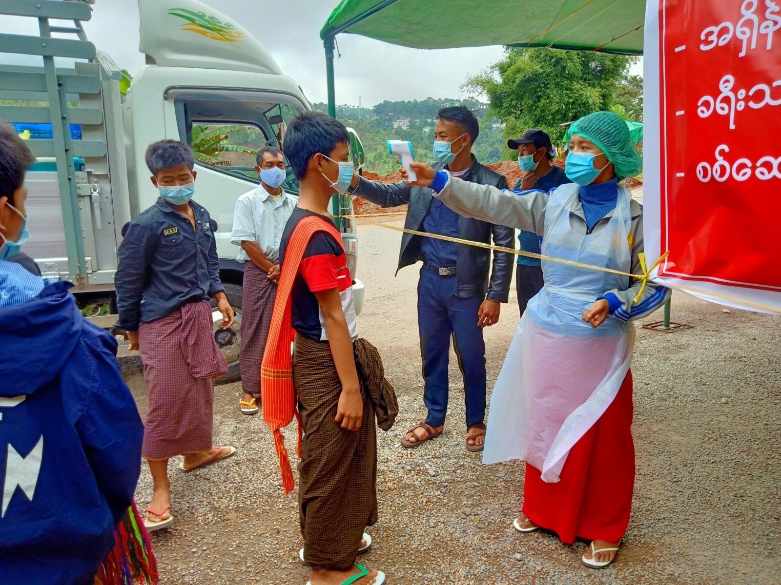 ရှမ်းပြည်နယ်(တောင်ပိုင်း) တောင်ကြီးခရိုင်၊ ကလောမြို့နယ်တွင် ကိုဗစ်-၁၉ ကူးစက်ရောဂါ ပြန့်ပွားမှု မဖြစ်ပေါ်စေရေးနှင့် ကာကွယ်ထိန်းချုပ်ရေး လုပ်ငန်းများကို အရှိန်အဟုန်မြှင့် ဆောင်ရွက်လျက်ရှိရာ ယနေ့ နံနက် ၆ နာရီအချိန် ကလောမြို့ ပြည်ထောင်စုလမ်းမကြီး မြို့အဝင်ဂိတ်တို့တွင် ခရီးသွားပြည်သူများအား ကိုယ်အပူချိန်များ တိုင်းတာစစ်ဆေးခြင်းနှင့် အသိပညာပေးခြင်းလုပ်ငန်း များ ဆောင်ရွက်လျက်ရှိကြောင်း သိရသည်။