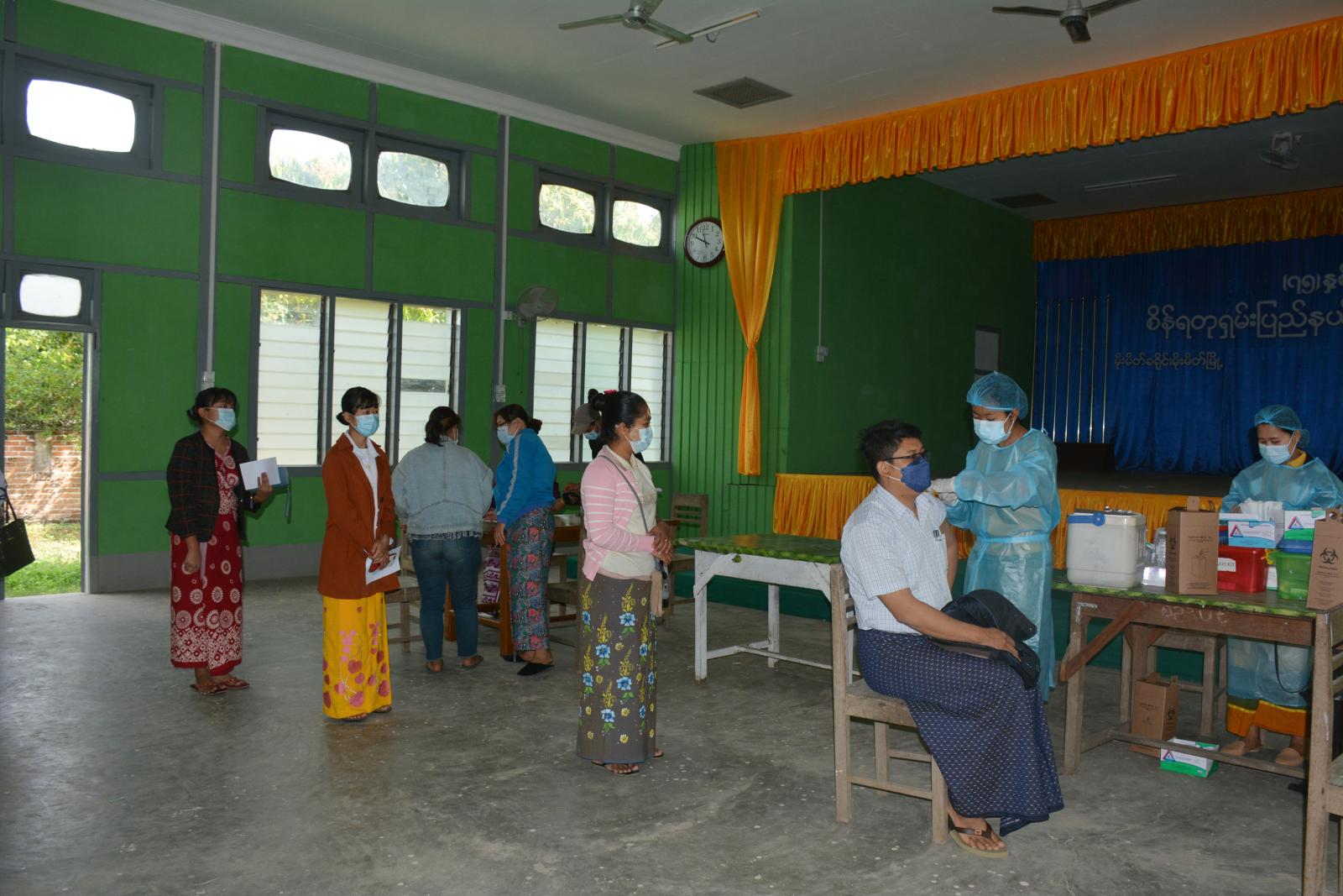 မိုးမိတ်မြို့အနေဖြင့် ဆေးလုံးရေ (၆၅)လုံးရရှိပြီး မြို့နယ်ကျန်းမာရေးဦးစီးဌာနမှ ကျန်းမာရေး ဆရာမများနှင့် မြို့နယ်အထွေထွေအုပ်ချုပ်ရေးဦးစီးဌာနမှ ဝန်ထမ်း များနှင့် ကိုဗစ်ကာကွယ် ဆေးမထိုးမီ သွေးပေါင်ချိန်တိုင်းခြင်း၊ သွေးထဲတွင်ရှိသည့် အောက်ဆီဂျင် ပမာဏတိုင်းတာခြင်း၊ အပူချိန်တိုင်းတာ ခြင်းတို့ကို ဦးစွာ ဆောင်ရွက်ပြီး ယင်းလုပ်ငန်းစဉ်များ အခြေအနေမှန်ဖြစ်မှသာ ကာကွယ်ဆေး ထိုးနှံပေးခြင်းဖြစ်သည်။